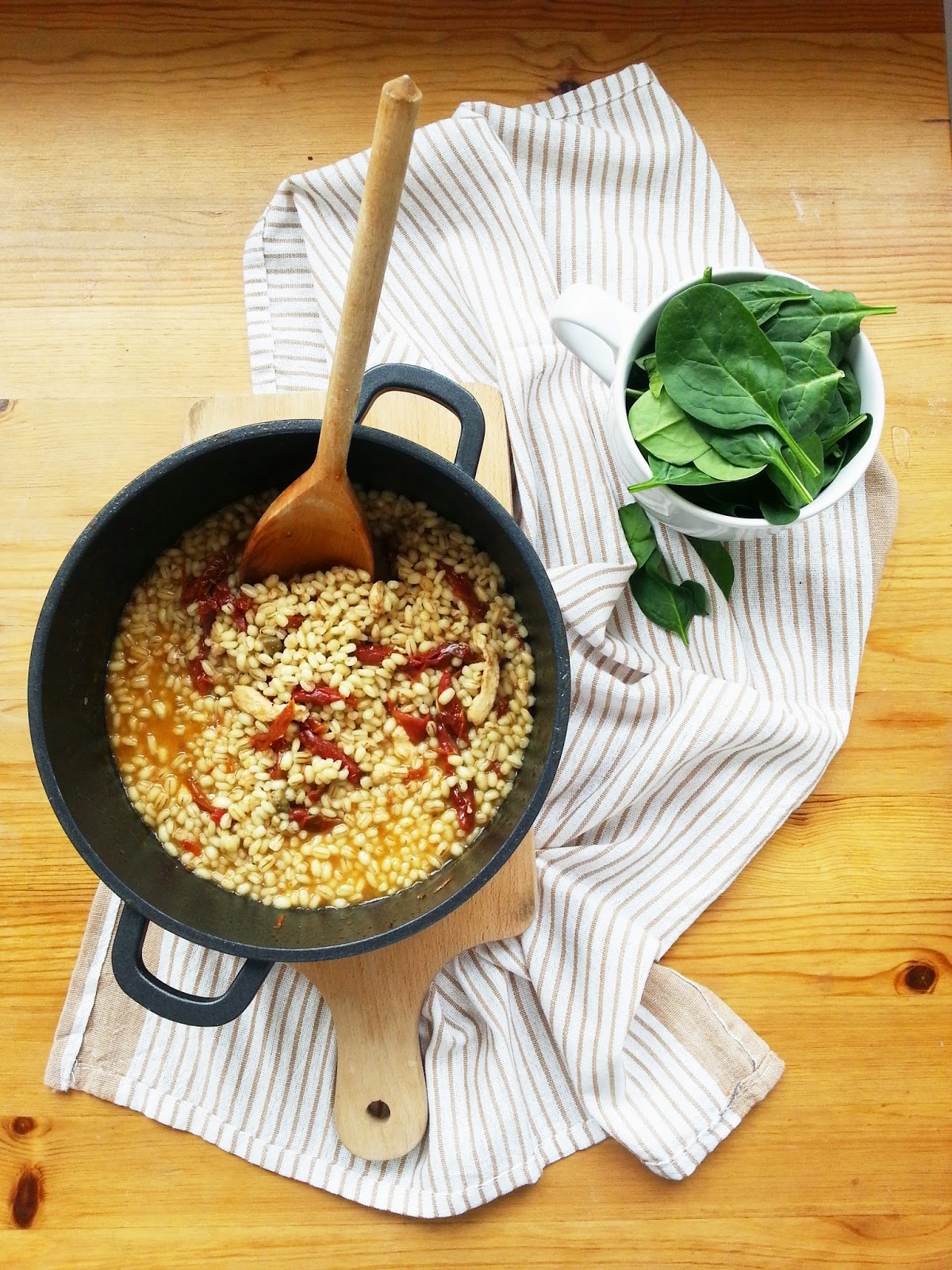 Do garnka wlewamy olej z suszonych pomidorw, a nast?pnie pokrojone w paski suszone pomidory i indyka, rwnie? pokrojonego w paski. Przysma?amy oko?o 7 minut. Dodajemy p?czak i sma?ymy 2 minuty. Nast?pnie dolewamy chochl? bulionu i czekamy, a? p?czak 'wypije’ bulion. Czynno?? powtarzamy, a? p?czak b?dzie gotowy (p?czak powinien by? al dente, ja gotowa?am oko?o 25-30 minut). Pod koniec gotowania wrzucamy szpinak i gotujemy jeszcze 2 minuty. Doprawiamy pieprzem i papryk? s?odk?!