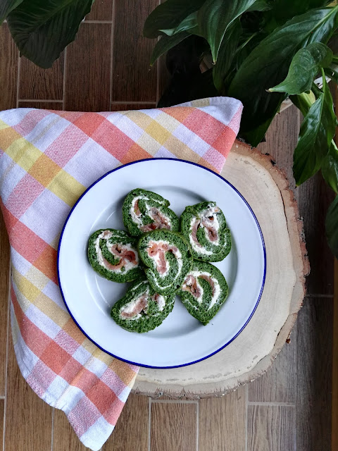Przygotowanie: Szpinak dok?adnie myjemy i osuszamy. Czosnek i cebul? drobno kroimy, a nast?pnie podsma?amy na ?y?ce oleju. Kiedy cebula i czosnek ju? si? przysma?? dodajemy szpinak i czekamy, a? zmniejszy obj?to??. Doprawiamy sol? i pieprzem. (je?li na patelni pojawi si? woda, to czekamy, a? odparuje). Nast?pnie szpinak rozdrabniamy na drobne kawa?eczki i odstawiamy. Do ostudzonego szpinaku dodajemy 2 ??tka oraz ?y?k? m?ki. Bia?ka ubijamy na sztywn? pian? i ??czymy z mas? szpinakow?. Mas? przek?adamy na blach? o wielko?ci 20×30 cm, wcze?niej wy?o?on? papierem do pieczenia. Blach? wk?adamy do piekarnika i pieczemy 20 minut w temp. 180 stopni. Po upieczeniu wyk?adamy na ?ciereczk?, odklejamy rolad? od papieru i zawijamy w rolad? (wzd?u? d?u?szego boku) i czekamy, a? ostygnie. Serek ??czymy z chrzanem. Po ostygni?ciu rolady smarujemy j? serkiem i uk?adamy ?ososia w?dzonego (u?o?y?am na po?owie rolady) i na koniec posytupujemy koperkiem. Rolad? dok?adnie zawijamy i kroimy na 2 cm kawa?ki.