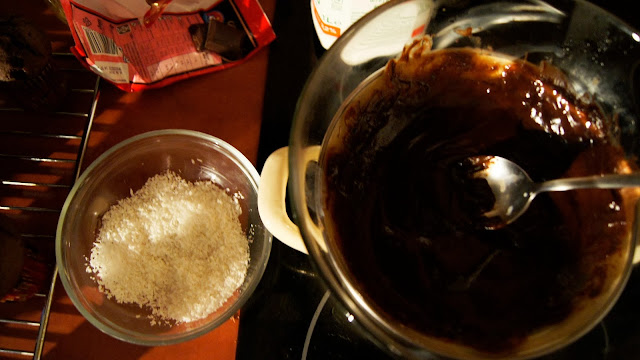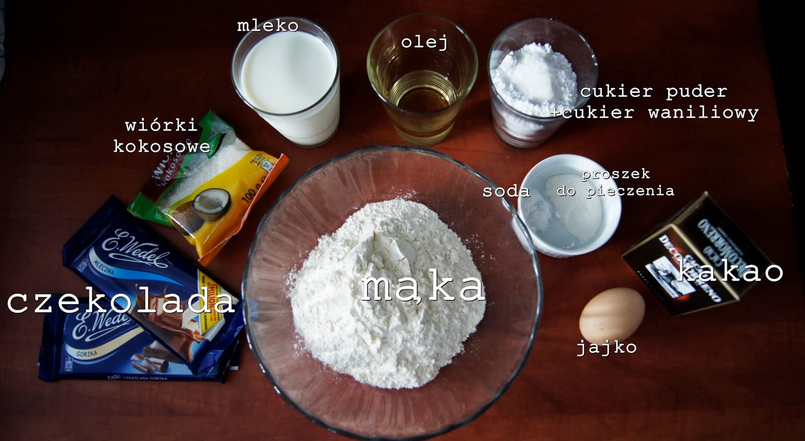 M?k?, proszek do pieczenia, sod?, cukier puder i waniliowy, kakao dok?adnie mieszamy w jednej misce. Do drugiej wlewamy mleko olej, jajko i rwnie? dok?adnie ??czymy. P? tabliczki mlecznej i p? tablicxzki gorzkiej czekolady kroimy na ma?e kawa?ki i dodajemy do suchych sk?adnikw. Mokre sk?adniki wlewamy do suchych i szybko ??czymy. Masa powinna mie? konsystencj? grudkow?. Ciasto na muffinki nale?y szybko miesza?, dzi?ki temu ciasto jest wilgotne i lekkie. Bierzemy form? do muffinkw i papilotki smarujemy olejem, ?eby ciasto do nich nie przywar?o. Nast?pnie ?y?ka (najlepeij tak? do lodw) nak?adamy ciasto do papilotek. Muffinki pieczemy przez 20 minut w temp. 180 stopni. Po upieczeniu i ostygni?ciu w k?pieli wodnej rozpuszczamy po po?wce mlecznej i gorzkiej czekolady i dodajemy kawa?ek mas?a. Ka?d? muffink? maczamy w polewie czekoladowej, a nast?pnie posypujemy wirkami kokosowymi! Smacznego! 🙂