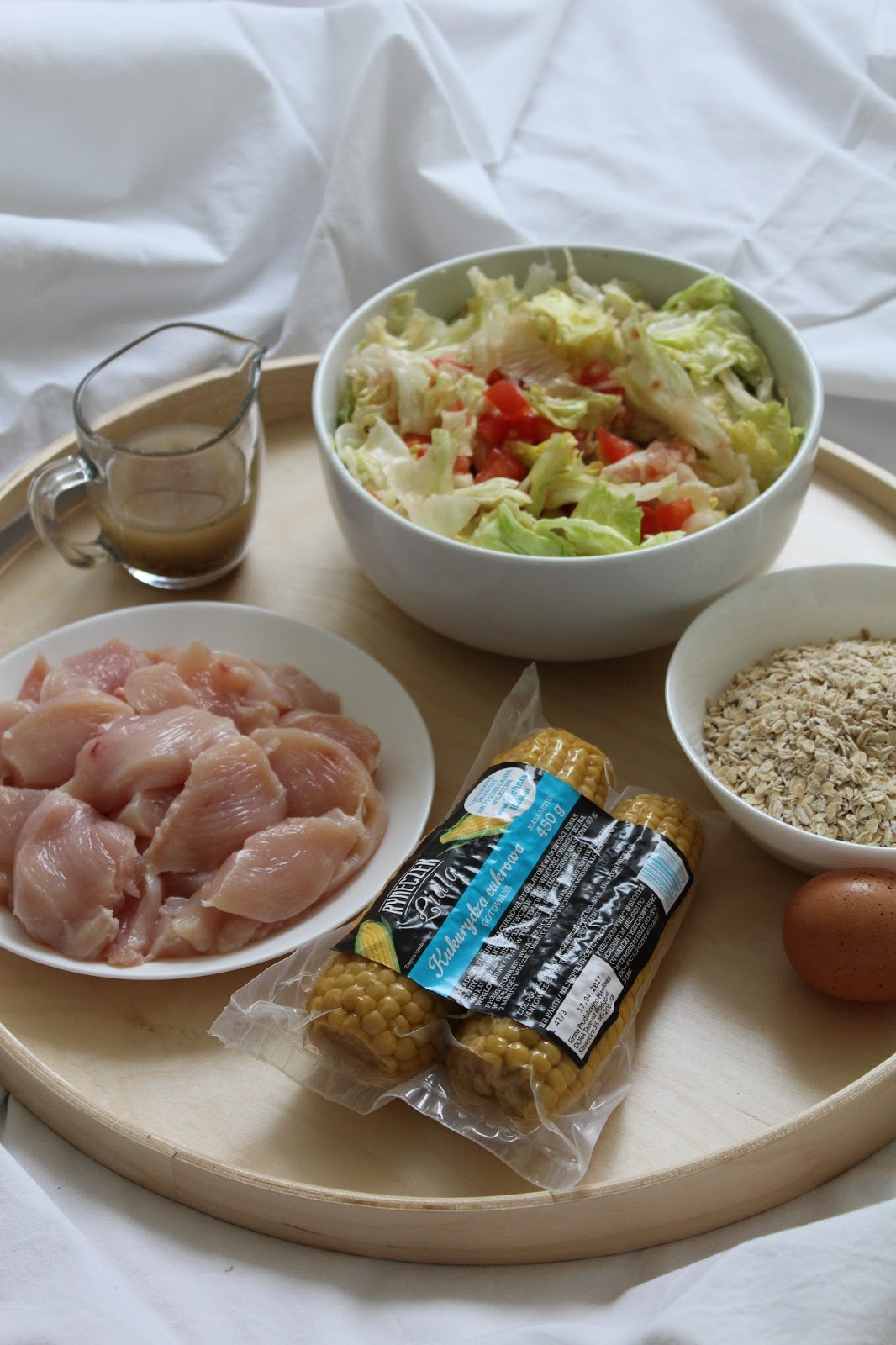 Kawa?ki kurczaka podajemy z sosem, sa?atk? i kolb? kukurydzy.