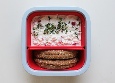 Rzodkiewki kroimy w drobn? kostk? i mieszamy razem z twaro?kiem, posiekan? rze?uch? lub szczypiorkiem i przyprawami. Po?ow? porcji przek?adamy do pude?ka i zabieramy z 2 kromkami chleba.