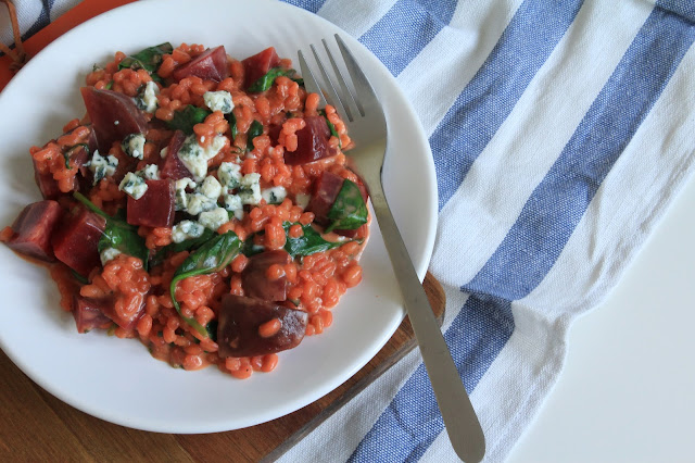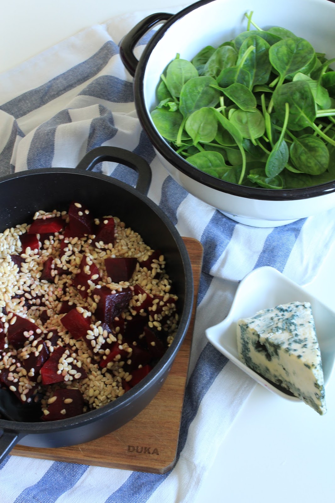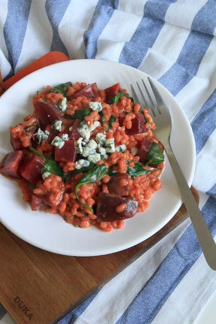 Na oleju przysma?amy pokrojonego w du?? kostk? buraka przez oko?o 2-3 minuty, nast?pnie wrzucamy kasz? i zalewamy wod? lub bulionem. Czynno?? powtarzamy do momentu, a? p?czak b?dzie ugotowany. Pokruszony ser dodajemy do p?czotto i czekamy, a? si? ca?kowicie rozpu?ci. Pod koniec gotowania wrzucamy szpinak i gdy zmi?knie danie b?dzie gotowe!