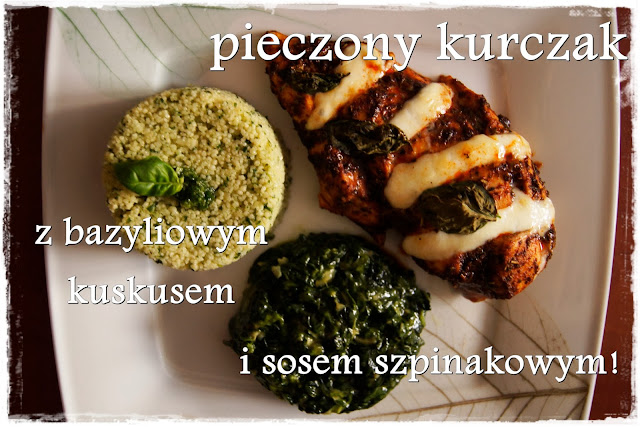 Papryk? ostr? i s?odk? mieszamy z zio?ami prowansalskimi, oliw? z oliwek i ?y?eczk? octu balsamicznego. Kurczaka myjemy i nacinamy w kostk?. Tak przygotowan? marynat? nacieramy kurczaka bardzo dok?adnie i odstawiamy do lodwki najlepiej na 2 godziny ( ale po 10 minutach je?li si? spieszymy te? mo?na wyj?? : ) ) . Przed w?o?eniem kurczaka do piekarnika, kroimy mozzarell? na paski i wk?adamy mi?dzy naci?cia kurczaka i do tego dodajemy po li?ciu bazylii. Nast?pnie wrzucamy pier? z kurczaka do piekarnika nagrzanego do 180 stopni na 15-20 minut. Gdy kurczak nam si? piecze czas przygotowa? dodatki. Cebul? kroimy w kostk?, z?bek czosnku przecieramy przez prask? i wrzucamy na patelni? ze ?rednio rozgrzanym olejem. Lekko rozmro?ony szpinak wrzucamy na patelni? z czosnkiem i cebul? i na wolnym ogniu pogrzewamy. Gdy ju? ca?kowicie si? rozmrozi dodajemy ?mietan?, solimy i pieprzymy i czekamy a? sos nam zg?stnieje. W tym czasie kuskus zalewamy odrobin? oliwy z oliwek i odstawiamy. Czas przygotowa? bazyliowe pesto do kuskusu. Duu?? gar?? bazyli wrzucamy do blendera, dodajemy odrobin? migda?w, z?bek czosnku, oliwe z oliwek, solimy i pieprzymy i na koniec blendujemy. Kuskus zalewamy wrz?c? wod? i czekamy a? b?dzie gotowy. Na koniec dodajemy do niego pesto i dok?adnie mieszamy. Wszystkie sk?adniki wyk?adamy na talerz i zajadamy si? pysznym daniem! Smacznego Kochani!! :))