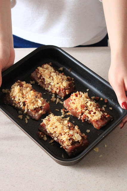 Pol?dwiczki dzielimy na p? i kolejno wzd?u? na p?, aby otrzyma? 4 kawa?ki. W miseczce mieszamy wszystkie sk?adniki marynaty i marynujemy mi?so. Odstawiamy na oko?o godzin?. Teraz zabieramy si? za past? z suszonych pomidorw: pomidory kroimy w drobn? kostk?, dodajemy ser ??ty i pieprz i dok?adnie mieszamy. Pasta z migda?w: Drobno posiekane migda?y mieszamy z bu?k? tarta i olejem rzepakowym. Mi?so przek?adamy do naczynia do pieczenia (je?li macie naczynie ?aroodporne to najpierw rozgrzewamy puste naczynie i dopiero przek?adamy do niego mi?so). Na mi?so nak?adamy past? z suszonych pomidorw, a nast?pnie z migda?w. Pieczemy mi?so w temp. 160 stopni przez 25 minut. Ziemniaki gotujemy do mi?kko?ci. Nast?pnie t?uczemy ziemniaki i ?y?k? mas?a na g?adkie puree. Na talerz wyk?adamy puree, a na to pol?dwiczki i gotowe!