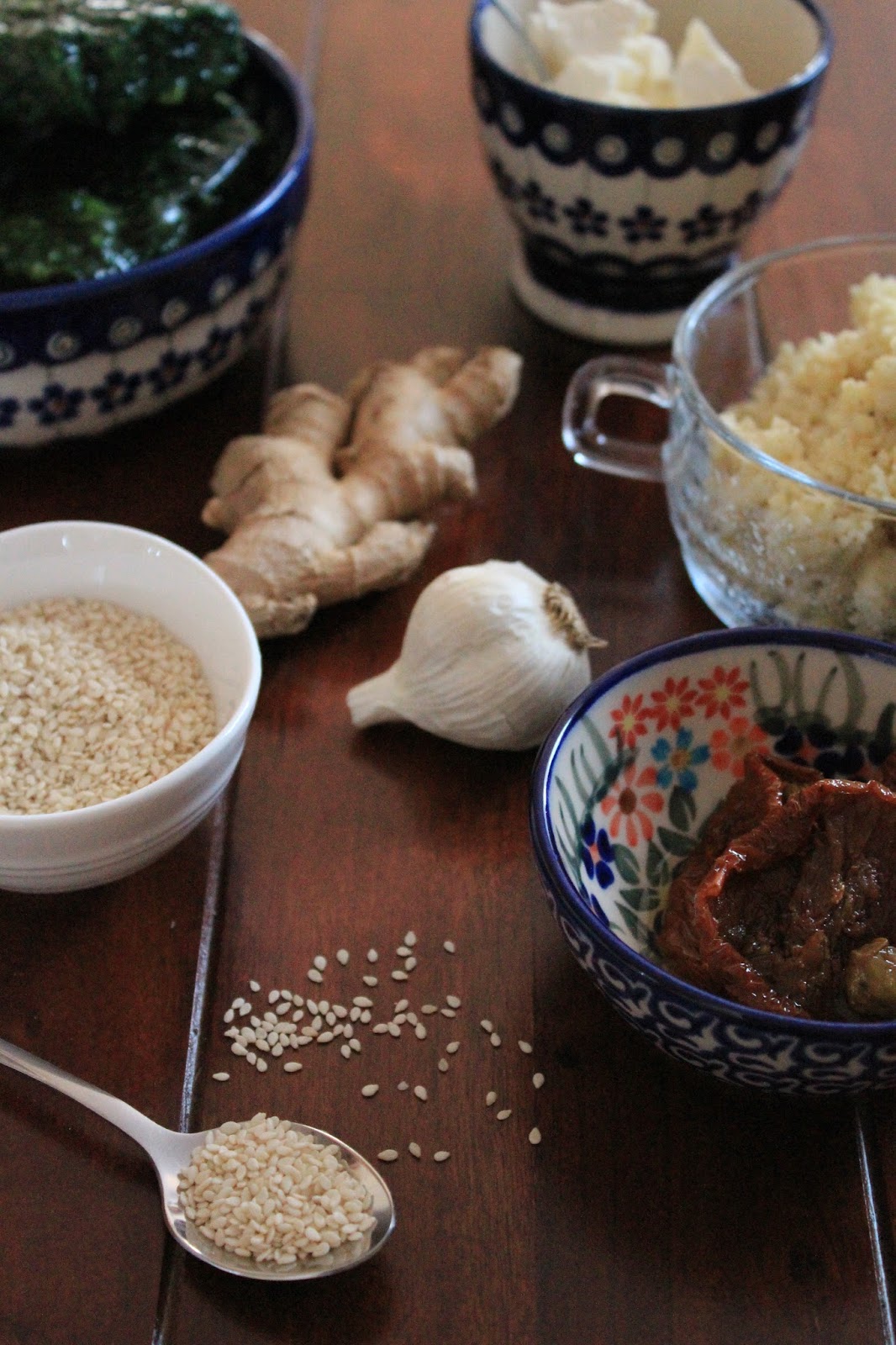 Przygotowanie: Czosnek i imbir kroimy w bardzo drobn? kostk?, a suszone pomidory w nieco wi?ksz?. Rozgrzewamy olej na patelni i przysma?amy czosnek, imbir i pomidory. Szpinak myjemy (lub je?li mamy mro?ony czekamy, a? troch? si? rozmrozi) i kroimy na mniejsze kawa?ki. Wrzucamy na patelni? i czekamy, a? zmi?knie. Dodajemy kasz? jaglan? i dok?adnie mieszamy. Doprawiamy sol? i pieprzem i na koniec wrzucamy serek i wszystkie sk?adniki ??czymy. Odstawiamy do ostygni?cia. Do p?askiej miseczki wlewamy letni? wod? i wrzucamy papier ry?owy, i czekamy chwil? a? zmi?knie. Wyk?adamy go na p?misku, nak?adamy po ?y?eczce farszu i zawijamy. Metoda zawijania jest dowolna, mo?na z?o?y? jak krokiety, lub zrobi? ma?e paczuszki. Nast?pnie gotujemy piero?ki na parze oko?o 4 minuty i podajemy ciep?e z sosem sojowym i sezamem!