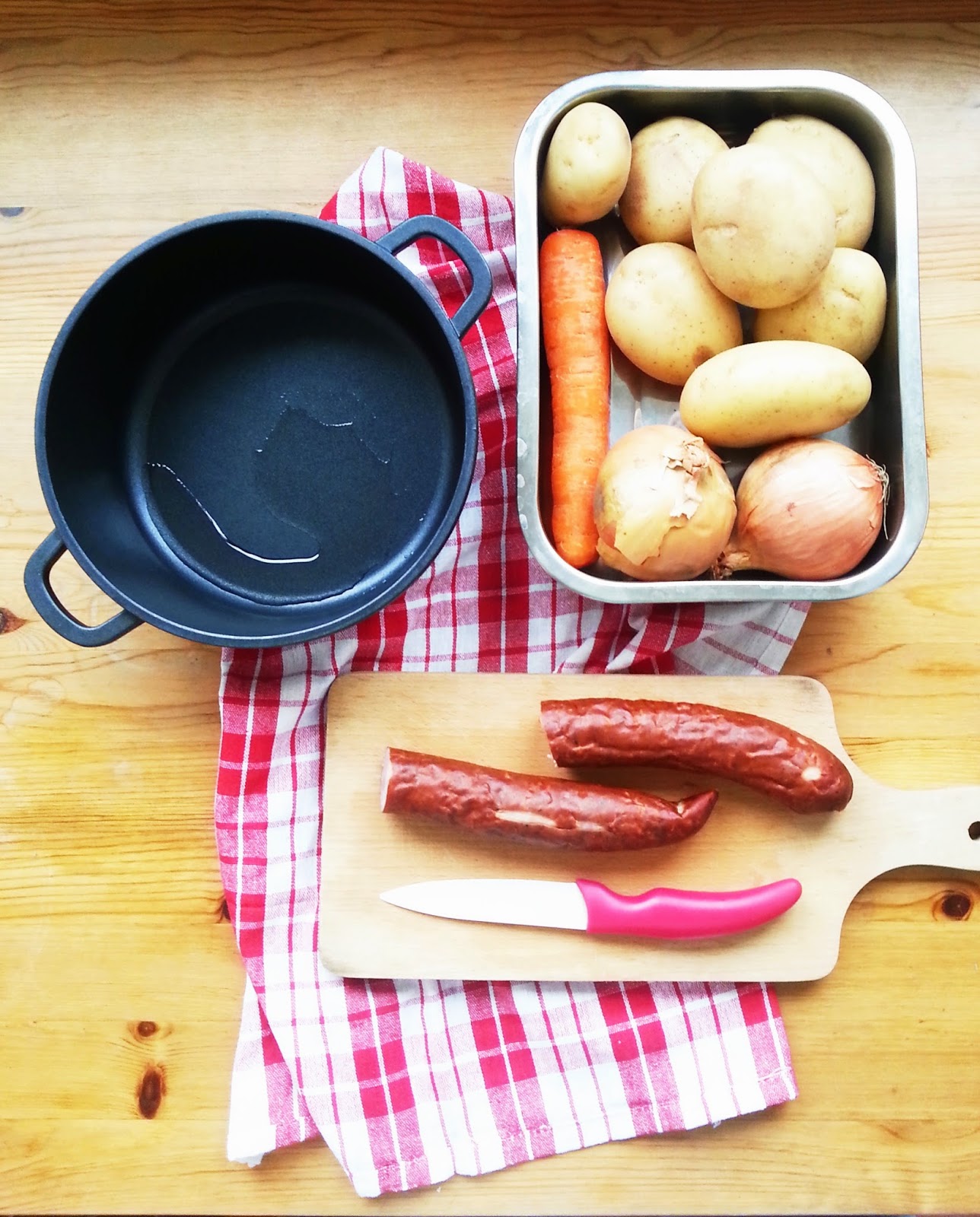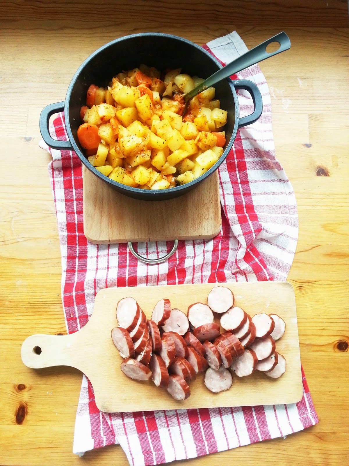 Cebul? kroimy w pirka, a czosnek na plasterki i dusimy na oleju, a? cebula b?dzie szklista. Kroimy ziemniaki w kostk? i wrzucamy do cebuli i dusimy 10 minut. Nast?pnie obieramy marchew i rwnie? kroimy w plastry i wrzucamy do garnka wraz z przyprawami. Dusimy oko?o 20 minut, po czym wrzucamy pokrojon? w plastry kie?bas?. Dusimy jeszcze do momentu, a? ziemniaki b?d? mi?kkie.