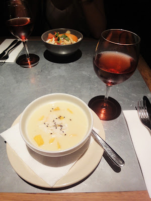 Na przystawk? wybra?y?my wytrawny krem kokosowy z nektarynkami i sa?atk? owocowo-warzywn? z serem kozim i sosem mi?towym.