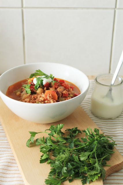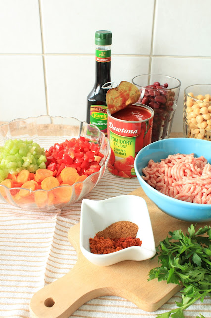 Cebul? i czosnek kroimy w plasterki i wrzucamy na olej i sma?ymy 2 minuty. Marchew i seler kroimy w plasterki, papryk? w kostk? i wrzucamy do garnka. Dodajemy przyprawy i sma?ymy oko?o 5-7 minut. Nast?pnie odcedzamy ciecierzyc? i fasol? i wrzucamy do garnka razem z pomidorami. Mi?so dzielimy na ma?e kawa?ki i rwnie? dodajemy do przysma?aj?cych si? warzyw. Do pustej puszki po pomidorach wlewamy wod? i zalewamy nasze danie. Ca?o?? mieszamy i gotujemy na wolnym ogniu oko?o godziny. Pod koniec gotowania dodajemy posiekan? natk? pietruszki. Podajemy z kleksem jogurtu i natk? pietruszki.