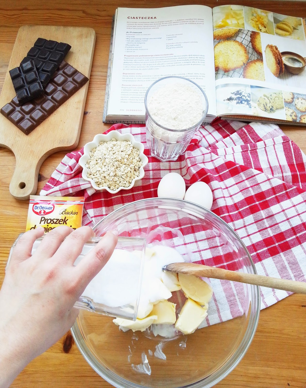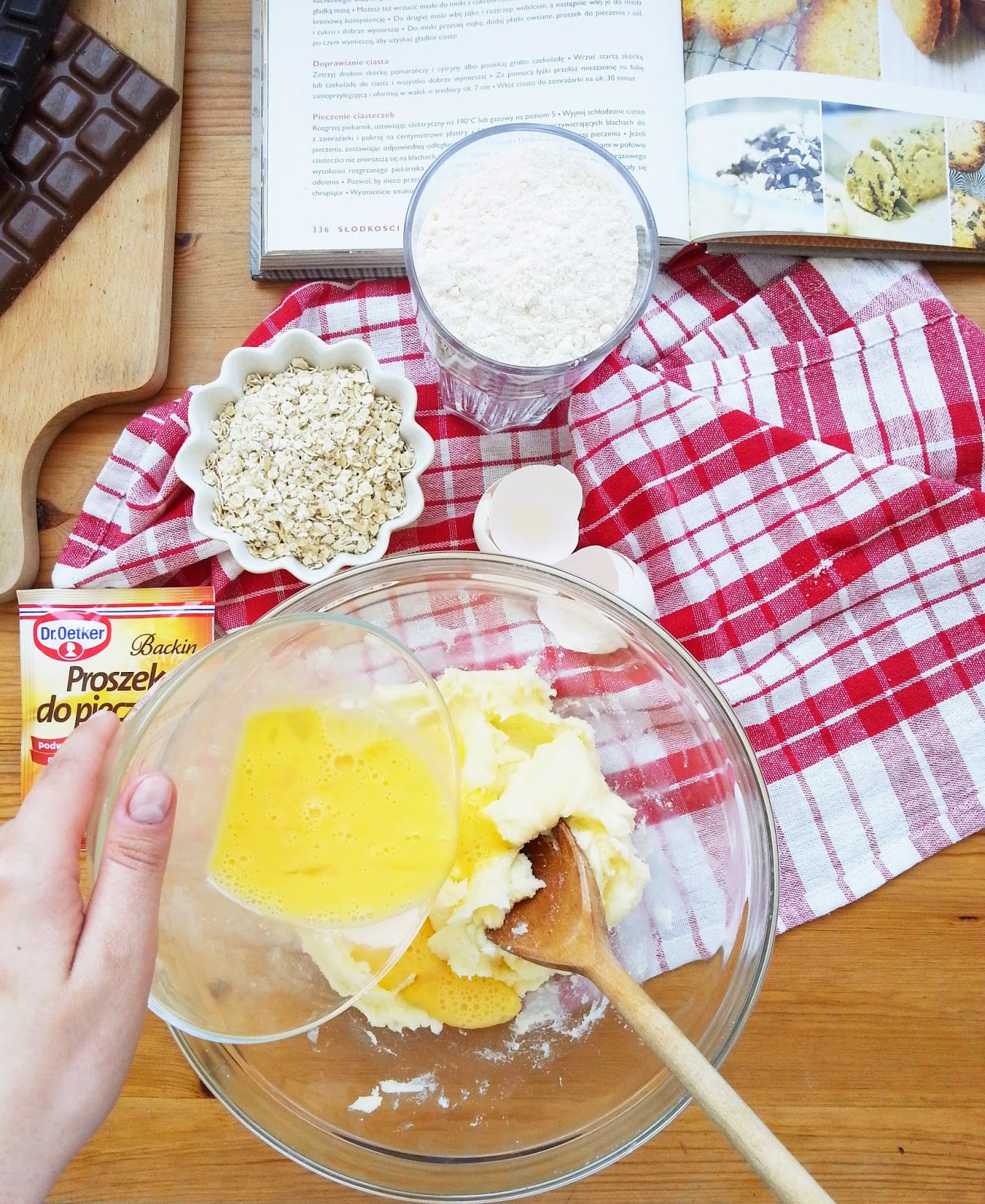 Mas?o wyjmujemy z lodwki na oko?o 20 minut przed przygotowaniem ciastek. Mas?o ucieramy z cukrem (albo drewnian? ?y?k?, albo mikserem, ja najpierw podzieli?am mas?o na mniejsze kawa?ki, a nast?pnie ??czy?am sk?adniki r?kami na g?st? kremow? mas?.) Jajka rok?camy widelcem w drugiej miseczce i dodajemy do mas?a z cukrem i dok?adnie ??czymy sk?adniki. Nast?pnie dodajemy przesian? m?k?, proszek do pieczenia, sl i p?atki owsiane. ??czymy sk?adniki. Czekolad? kroimy na ma?e kawa?ki i dodajemy do ca?ej masy i dok?adnie mieszamy. Masa powinna by? dosy? klej?ca. Rozk?adamy foli? spo?ywcz? i nak?adamy na ni? mas? w kszta?t walca. Owijamy ca?? mas? foli? spo?ywcz? i tworzymy taki cukierek zakr?caj?c brzegi folii. Nast?pnie ciasteczka wk?adamy do zamra?alnika na minimum 30 minut. Nast?pnie wyjmujemy ciastka z folii, kroimy w plastry, uk?adamy na blasze wy?o?onej papierem do pieczenia i pieczemy 8-11 minut w 180 stopniach na ?rodku piekarnika. Brzegi powinny by? zarumienione. Wyjmujemy i zostawiamy do ostygni?cia. Ciastka pieczemy partiami.