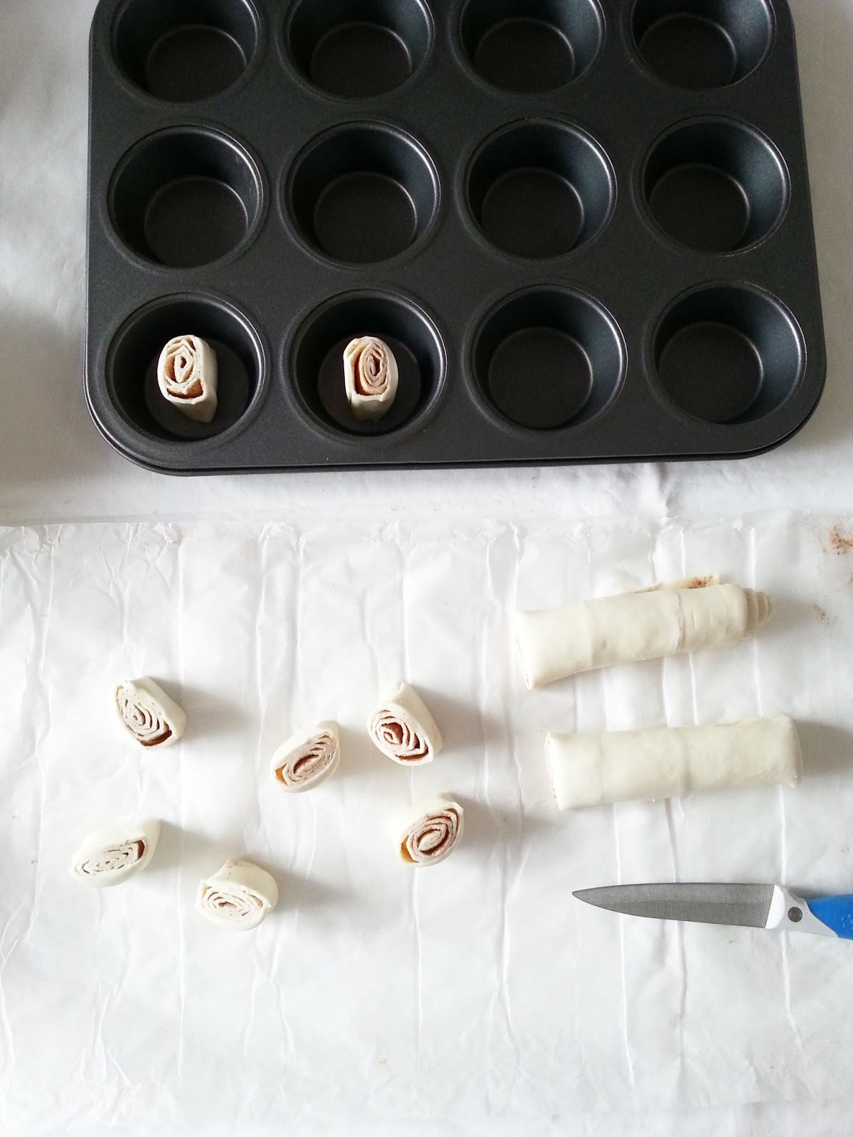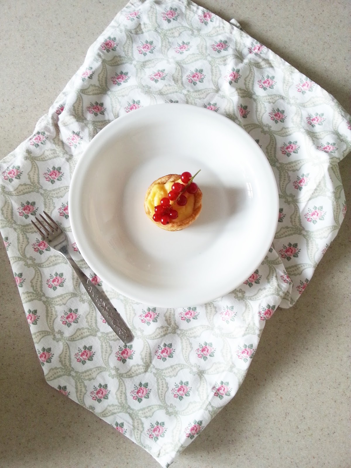 Budy? gotujemy wg instrukcji na opakowaniu i zostawiamy do ostygni?cia. Ciasto francuskie rozk?adamy na blacie, posypujemy cukrem i cynamonem. Nast?pnie rolujemy ciasto. Kroimy na kawa?ki mniej wi?cej 5 cm i wyk?adamy nim form? na muffinki, tworz?c koszyczki. Nast?pnie wype?niamy je budyniem. Babeczki pieczemy w temp. 220 stopni oko?o 20-25 minut. Podajemy z czerwonymi porzeczkami lub innymi ulubionymi owocami.