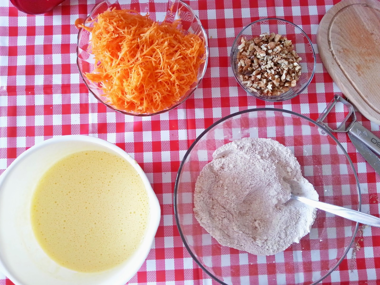 Musimy pami?ta?, ?e wszystkie sk?adniki musz? mie? temperatur? pokojow?. W misce mieszamy suche sk?adniki: m?k?, sl, cukier, proszek, przyprawy i sod?. Za pomoc? miksera ubijamy jajka z olejem, a? masa b?dzie puszysta. Marchewk? trzemy na tarce o ma?ych oczkach, lub u?ywamy specjalnego robota (np. firmy Moulinex). Orzechy w?oskie kroimy na mniejsze cz??ci. Do suchych sk?adnikw wlewamy ubite z olejem jajka, dodajemy marchewk? i orzechy. Ca?o?? delikatnie mieszamy i przelewamy do tortownicy o ?rednicy 26 cm. Ciasto pieczemy 40-50 minut w temperaturze 180 stopni.