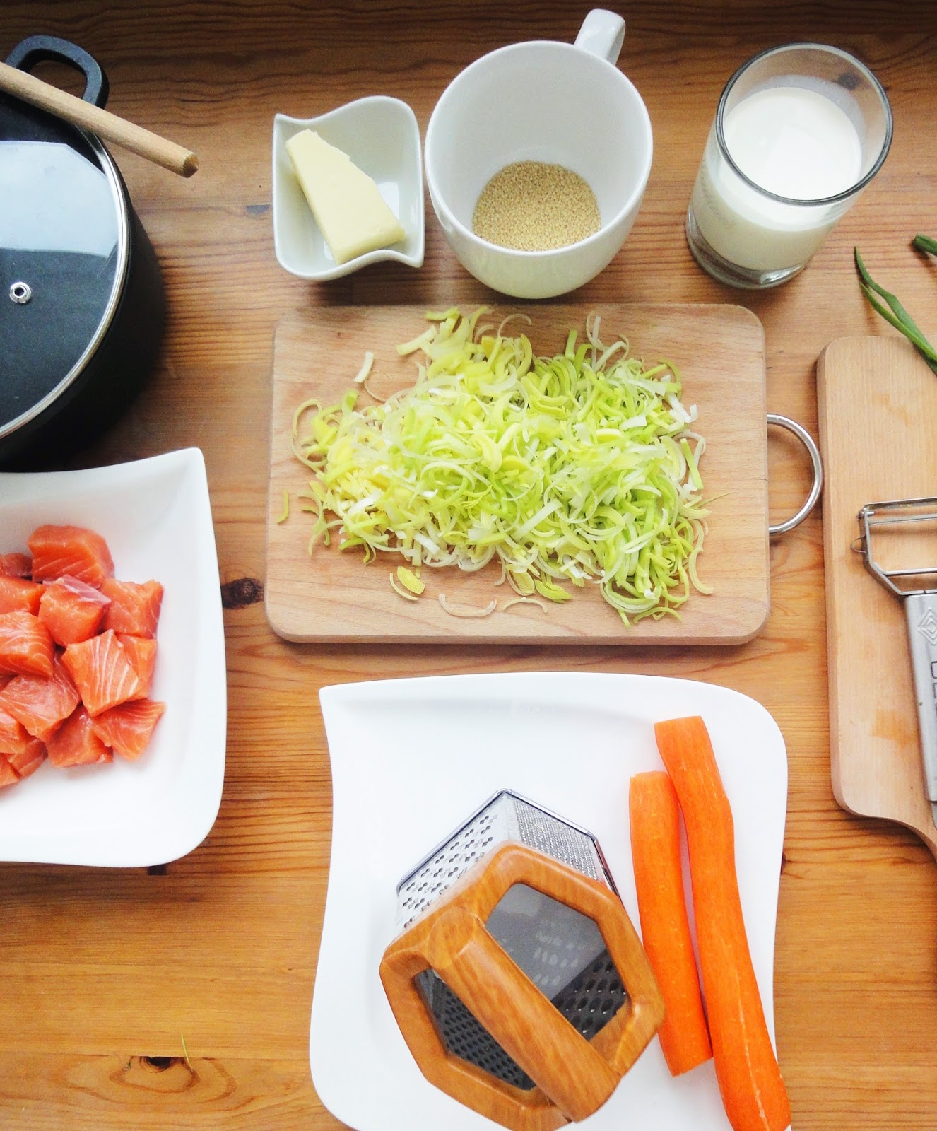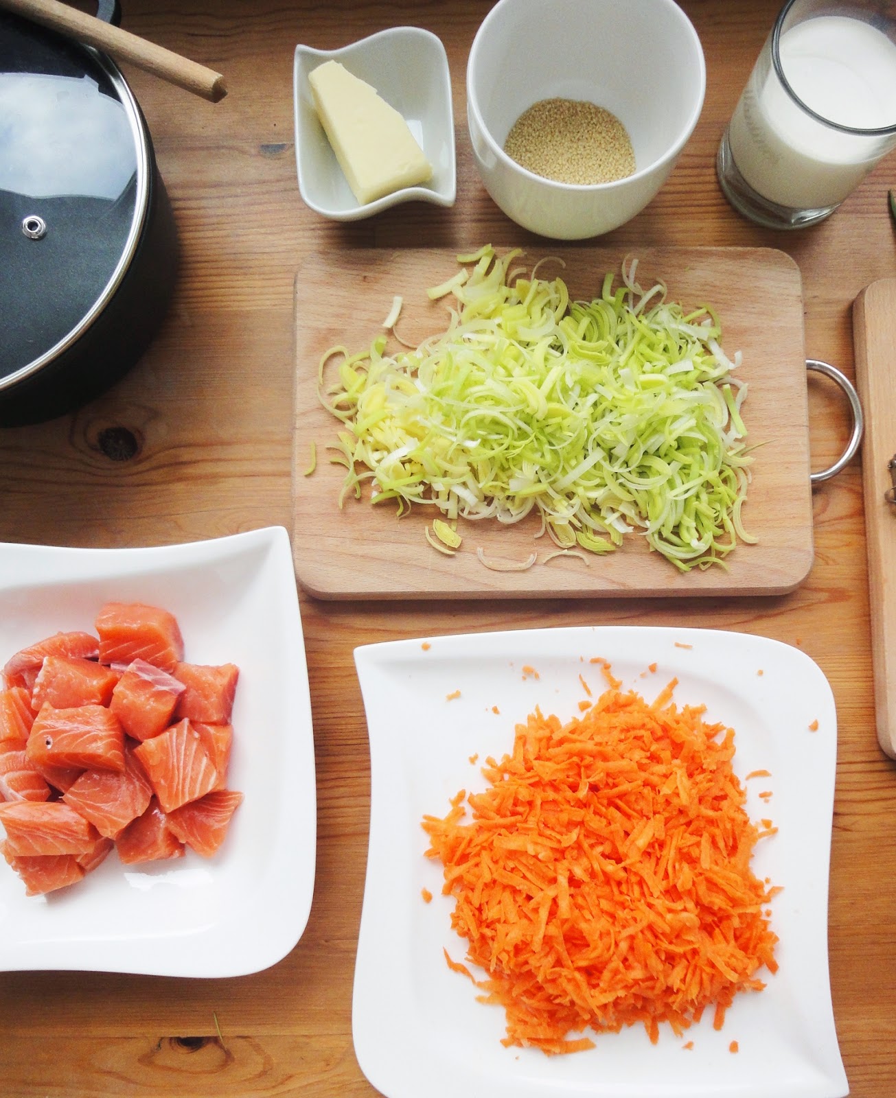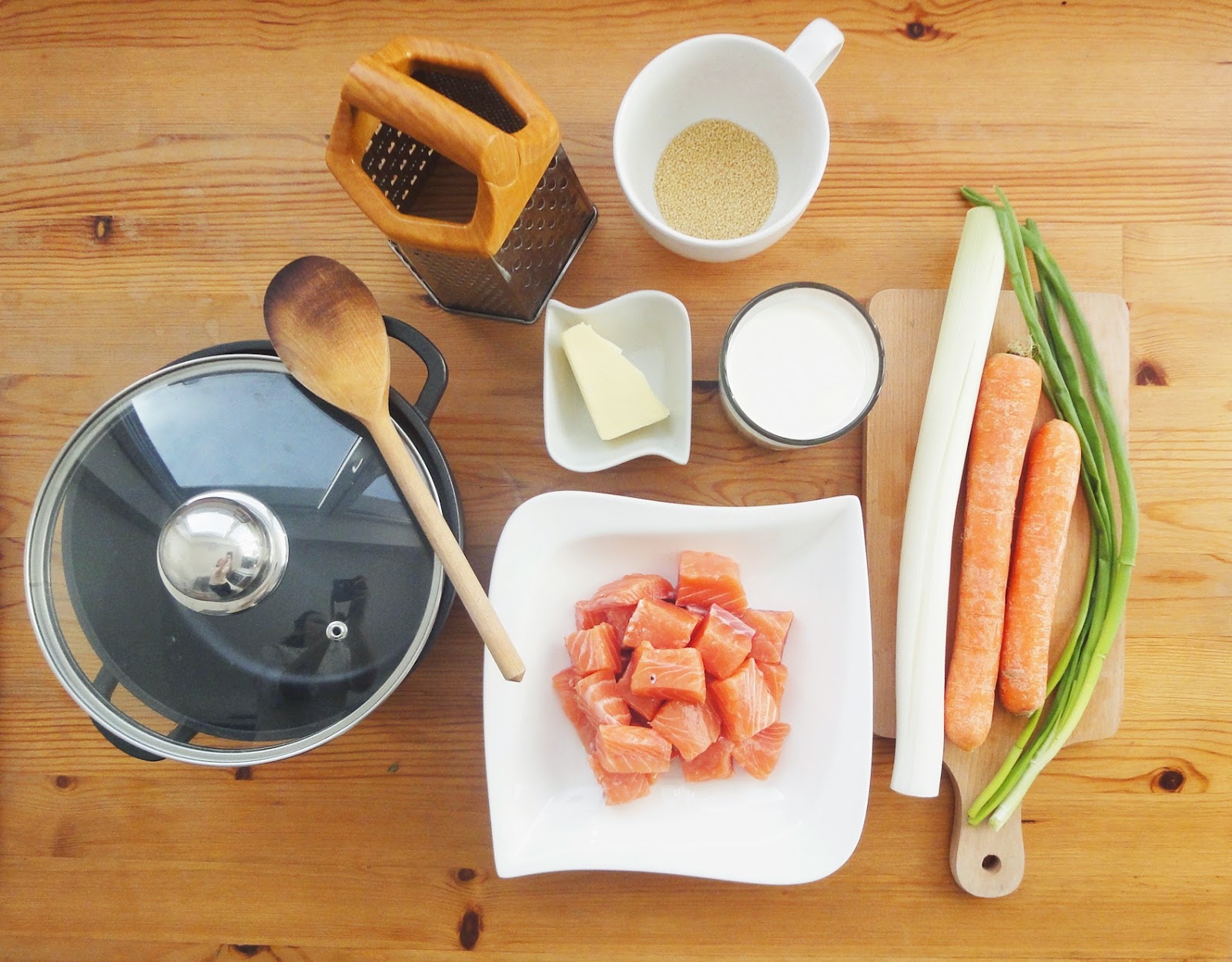 Usuwamy skr? z ?ososia i kroimy go w du?a kostk?. Marchewk? trzemy na tarce o du?ych oczkach. Pora kroimy w cienkie paseczki. W garnku rozgrzewamy mas?o i na dnie uk?adamy ca?a ryb?. Doprawiamy sol? i pieprzem. Chwil? sma?ymy i dodajemy marchewk? ponownie dodaj?c sl i pieprz. Po raz kolejny gotujemy przez 2 minuty, dodajemy pora i doprawiamy. Ca?o?? zalewamy ?mietan? i gotujemy przez 10-15 minut. Mo?na przykry? garnek jednak nale?y zostawi? wieko uchylone. Kuskus zalewamy wrz?tkiem i po 5 minutach doprawiamy sol?, ostr? papryk? i odrobin? mas?a. Posypujemy szczypiorkiem lub natk? pietruszki do dekoracji. Smacznego!