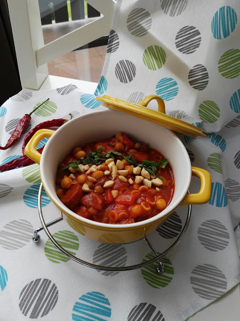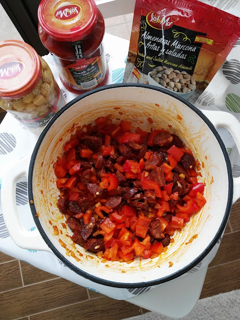 Olej wlewamy do du?ego garnka i dodajemy pokrojon? w p?plasterki kie?bas? chorizo. Gdy t?uszcz si? z niej wytopi mo?e go troch? odla?, je?li nie chcemy zbyt t?ustego dania. Nast?pnie dodajemy posiekany czosnek i cebul?. Sma?ymy ca?o?? 2 minuty na wolnym ogniu. Nast?pnie dodajemy pokrojon? w wi?ksz? kostk? papryk? obran? ze skry i dusimy kolejne 2-3 minuty. Danie zalewamy pomidorami, bulionem i 2 szklankami wody. Dodajemy kluseczki i gotujemy, a? b?d? mi?kkie. Pod koniec gotowania dodajemy ciecierzyc?. Ca?o?? gotujemy jeszcze 3 minuty. Podajemy z posiekanymi migda?ami i listkami ?wie?ej bazylii.