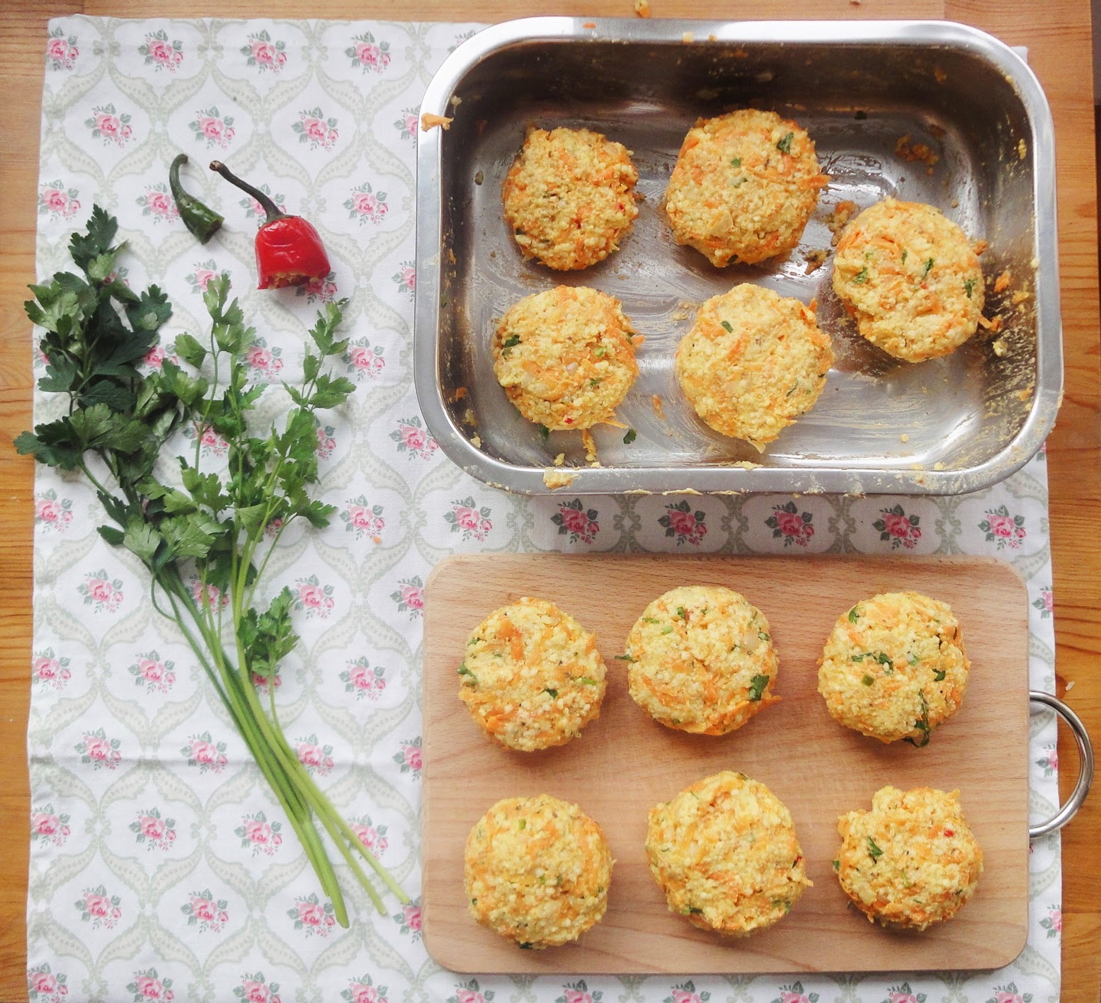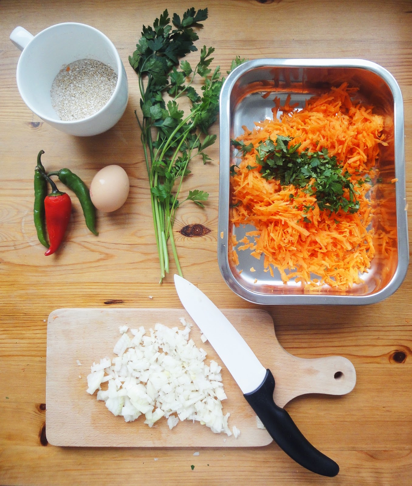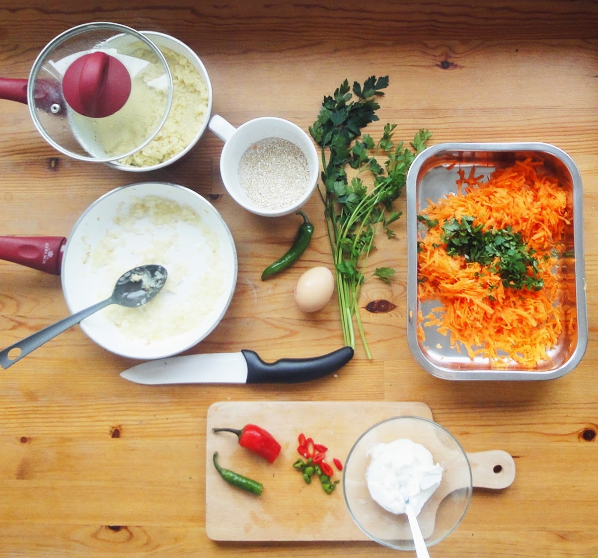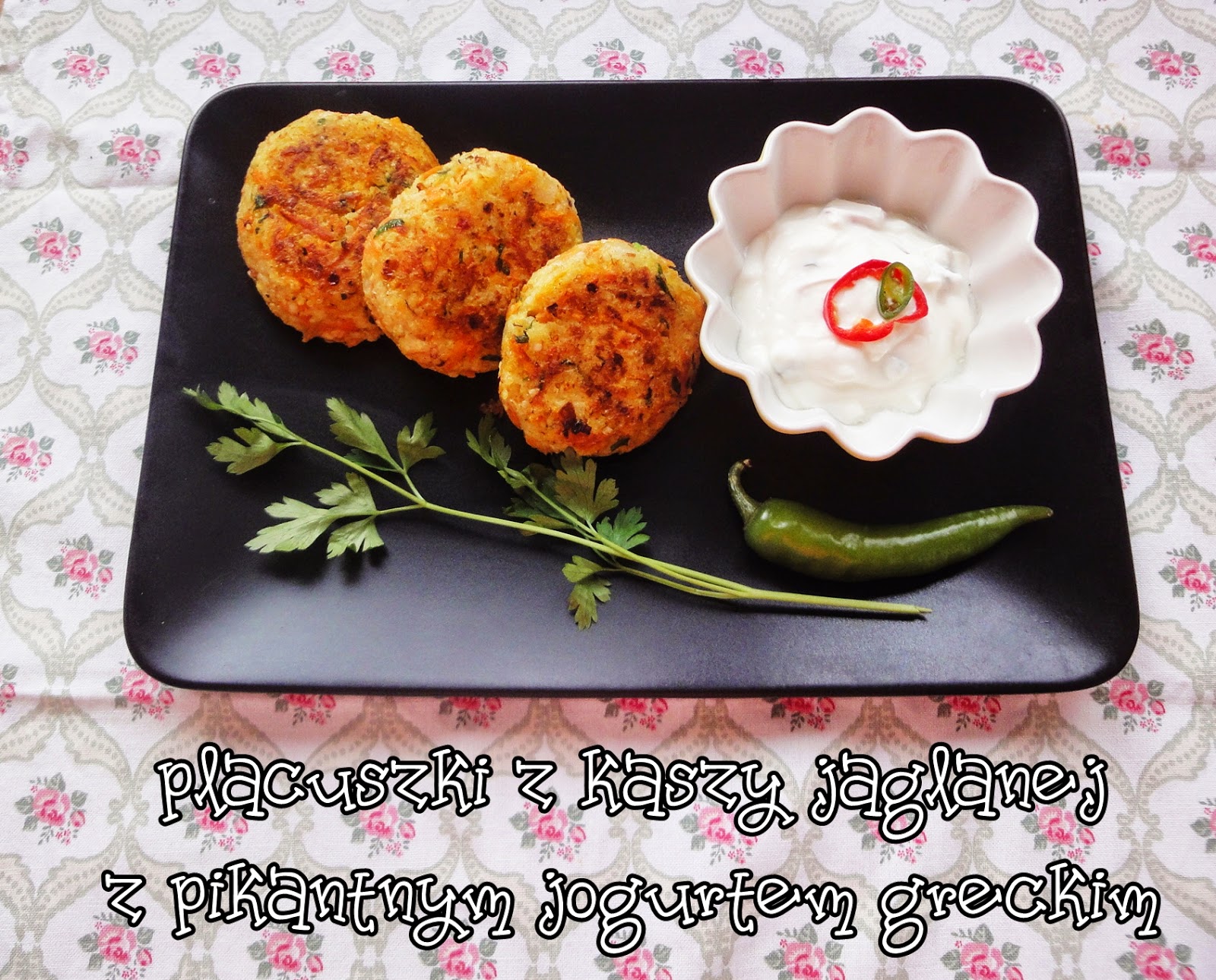 Kasz? gotujemy wed?ug instrukcji na opakowaniu. (Kasz? nale?y przep?uka? przed gotowaniem wod? dzi?ki temu pozbywamy si? goryczy). I zostawiamy do ostygni?cia. Cebul? pokrojon? w pirka przysma?amy na oleju i rwnie? zostawiamy do ostygni?cia. Marchew ?cieramy na tarce, p? p?czka pietruszki siekamy, a p? papryczki chili kroimy w drobn? kostk?. Wszystkie sk?adniki wrzucamy do miski i dok?adnie ??czymy ze sob?. Formujemy kotleciki i przysma?amy na oleju po oko?o 3-4 minuty na jednej stronie. Jogurt grecki ??czymy z pokrojonymi w plasterki papryczkami chili i dok?adnie mieszamy. Kotleciki podajemy z jogurtem!
