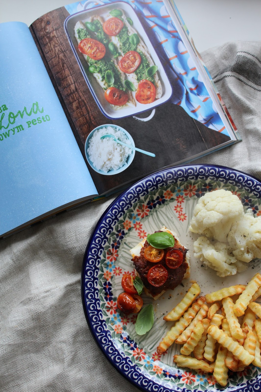 2-3 ?y?ki s?onecznikaWszystkie sk?adniki na pesto miksujemy za pomoc? blendera. Pol?dwice z dorsza dzielimy na dwie rwne cz??ci, oprszamy sol? i pieprzem, a nast?pnie wyk?adamy na foli? aluminiow?. Smarujemy wierzch du?? ?y?k? pesto, wrzucamy kilka pomidorkw przedzielonych na p? i dodajemy ?wie?? bazyli?. Ryb? pieczemy przez 10-12 minut w temp. 180 stopni.
