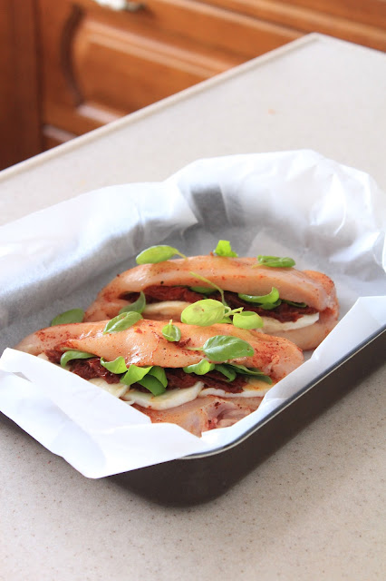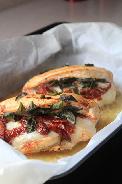 Kurczaka nacinamy w poprzek, tylko nie do ko?ca (tak jak na zdj?ciu). Kurczaka przyprawiamy sol?, pieprzem oraz s?odk? papryk?. W sakiewce uk?adamy mozzarell?, suszone pomidory i ?wie?? bazyli?. Kurczaka zapiekamy w temp. 180 stopni przez 30 minut.