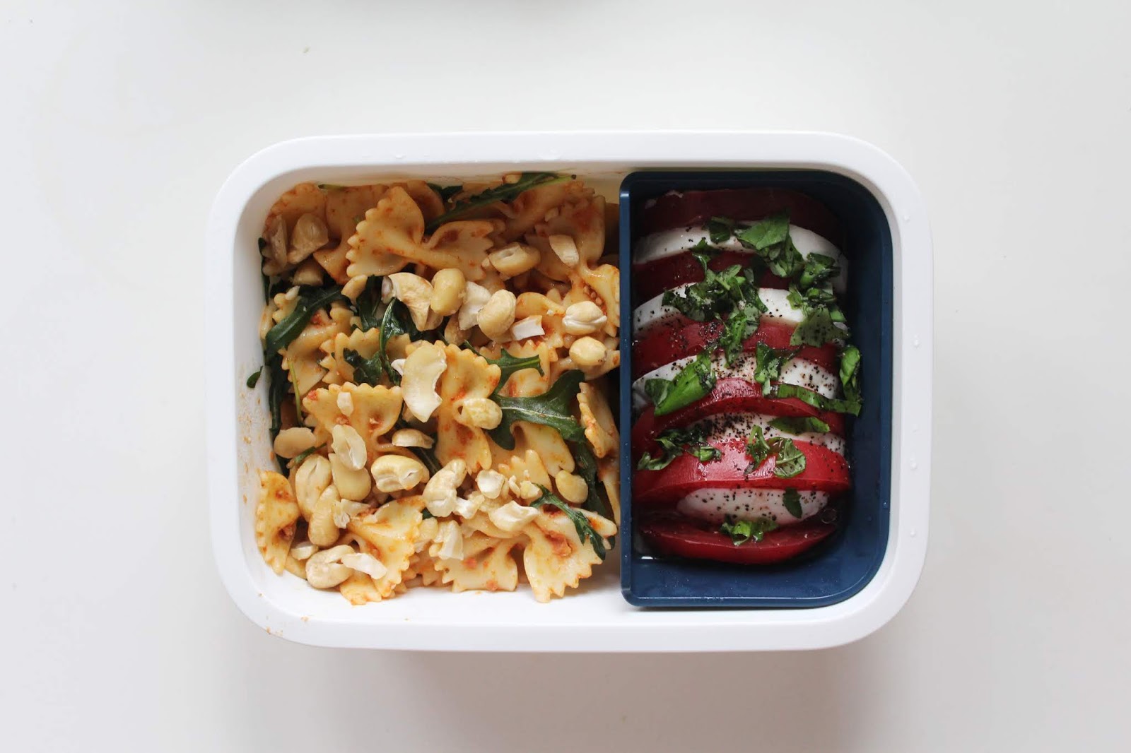 lunch: Makaron z pesto, rukol? i nerkowcami oraz pomidory z mozzarell? i bazyli?