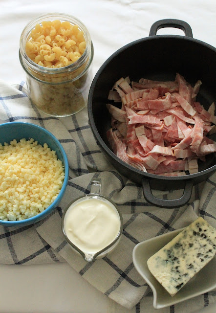 Makaron gotujemy al dente w nieosolonej wodzie (sos w sam sobie jest s?ony, wi?c nie ma potrzeby soli? makaronu). Boczek kroimy w paski i podsma?amy na ?y?ce oleju rzepakowego. Nast?pnie dodajemy ?mietan?. Kruszymy ser ple?niowy i dodajemy do garnka. Ca?y czas mieszamy, a gdy ser ple?niowy si? rozpu?ci, dodajemy tart? mozzarell? i rwnie? mieszamy ca?y czas. Kolejno dodajemy ga?k? i pieprz. Makaron odcedzamy i wrzucamy z powrotem do garnka, Sos wlewamy do makaronu i dok?adnie mieszamy wszystko. Ca?o?? nak?adamy na talerze i posypujemy serem.