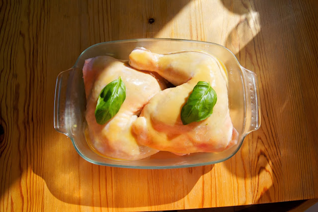 Udka myjemy, nast?pnie przyprawiamy sol? i pieprzem. Mid i musztard? mieszamy razem i polewamy kurczaka przygotowan? marynat?. Przek?adamy do naczynia ?aroodpornego, dekorujemy po listku bazylii i wstawiamy do lodwki na min. 1 godzin? (im wi?cej czasu kurczak b?dzie w marynacie tym lepiej).