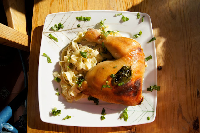 Makaron uk?adamy na talerzu i na niego nak?adamy udko z kurczaka. Ca?e danie posypujemy pokrojon? bazyli?.