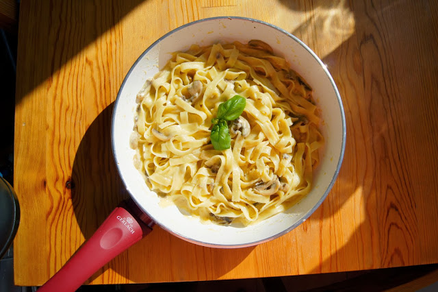 W osolonej wodzie gotujemy makaron. Po odcedzeniu, gdy sos b?dzie gotowy przek?adamy do niego makaron i mieszamy.