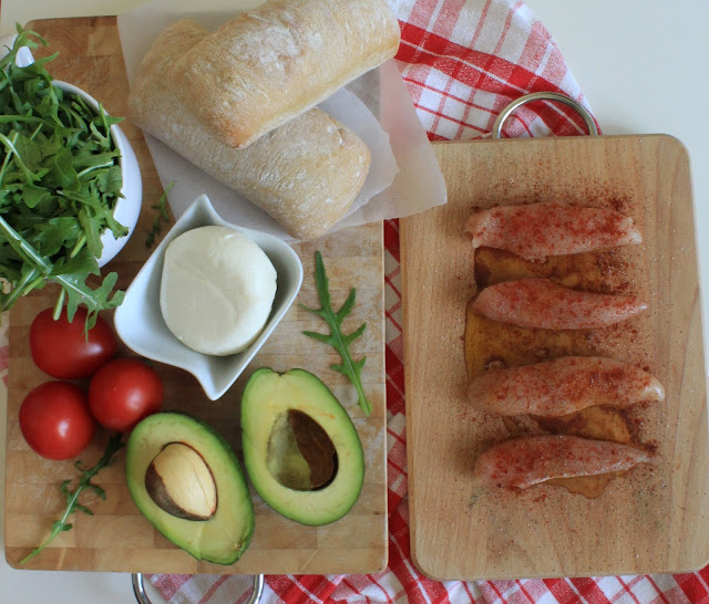 Awokado miksujemy razem z czosnkiem na g?adk? past?. Pomidory i mozzarell? kroimy w plasterki. Kurczaka marynujemy w przyprawach i sma?ymy na odrobinie oleju po 4 minuty z ka?dej strony (a? kurczak b?dzie z?ocisty). Je?li u?ywacie piersi z kurczaka pokrjcie je wzd?u? na 4 cz??ci, aby wielko?ci? przypomina?y pol?dwiczki. Ciabatt? kroimy wzd?u? i nak?adamy kolejno awokado, rukol?, kurczaka, pomidora i mozzarell?. Panini sp?aszczamy i wk?adamy do nagrzanego opiekacza. Pieczemy oko?o 8-10 minut, do zrumienienia bu?ki.