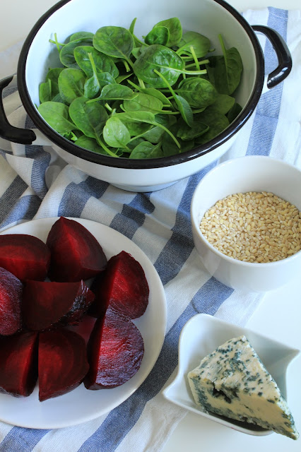 Na oleju przysma?amy pokrojonego w du?? kostk? buraka przez oko?o 2-3 minuty, nast?pnie wrzucamy kasz? i zalewamy wod? lub bulionem. Czynno?? powtarzamy do momentu, a? p?czak b?dzie ugotowany. Pokruszony ser dodajemy do p?czotto i czekamy, a? si? ca?kowicie rozpu?ci. Pod koniec gotowania wrzucamy szpinak i gdy zmi?knie danie b?dzie gotowe!