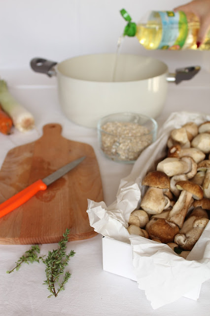 Grzyby starannie myjemy i kroimy na p?, a wi?ksze na ?wiartki. Cebul? kroimy w p?ksi??yce i przysma?amy na oleju. Nast?pnie dodajemy grzyby i sma?ymy oko?o 10-15 minut ( w razie gdyby grzyby zacz??y przywiera? do garnka podlewamy je wod?). Marchewk? i pora kroimy w plasterki i dorzucamy do grzybw razem z posiekanym tymianek i pietruszk?. Je?li u?ywamy wody zamiast bulionu nale?y w tym miejscu doda? wszystkie przyprawy. Kasz? p?uczemy pod wod? i rwnie? dodajemy do garnka. Ca?o?? zalewamy 2 wazowymi ?y?kami bulionu (lub wody) i czekamy, a? kasza wch?onie p?yn. Czynno?? powtarzamy, a? kasza b?dzie mi?kka. Danie nak?adamy na talerze i posypujemy posiekan? natk? pietruszki!