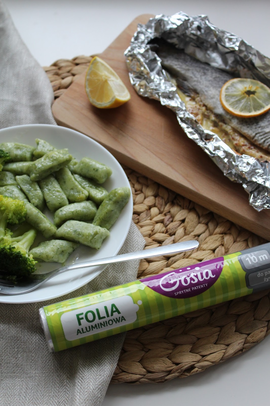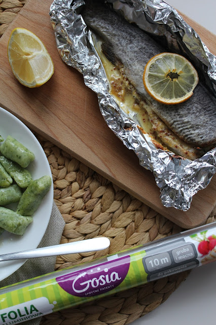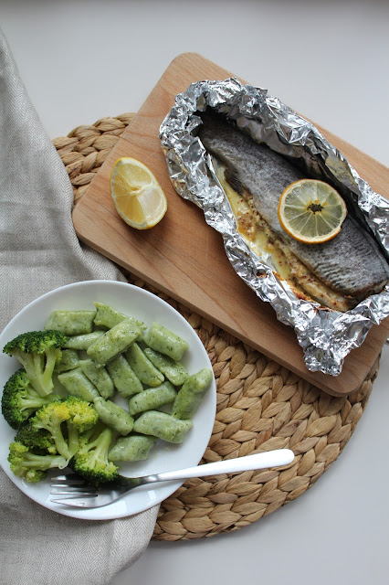 Pieczonego pstr?ga podajemy z cytryn?, broku?ami i kopytkami szpinakowymi!