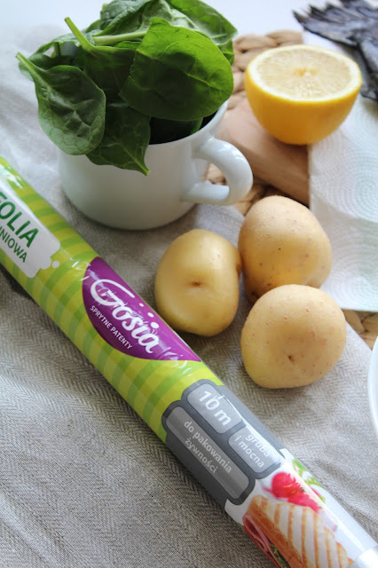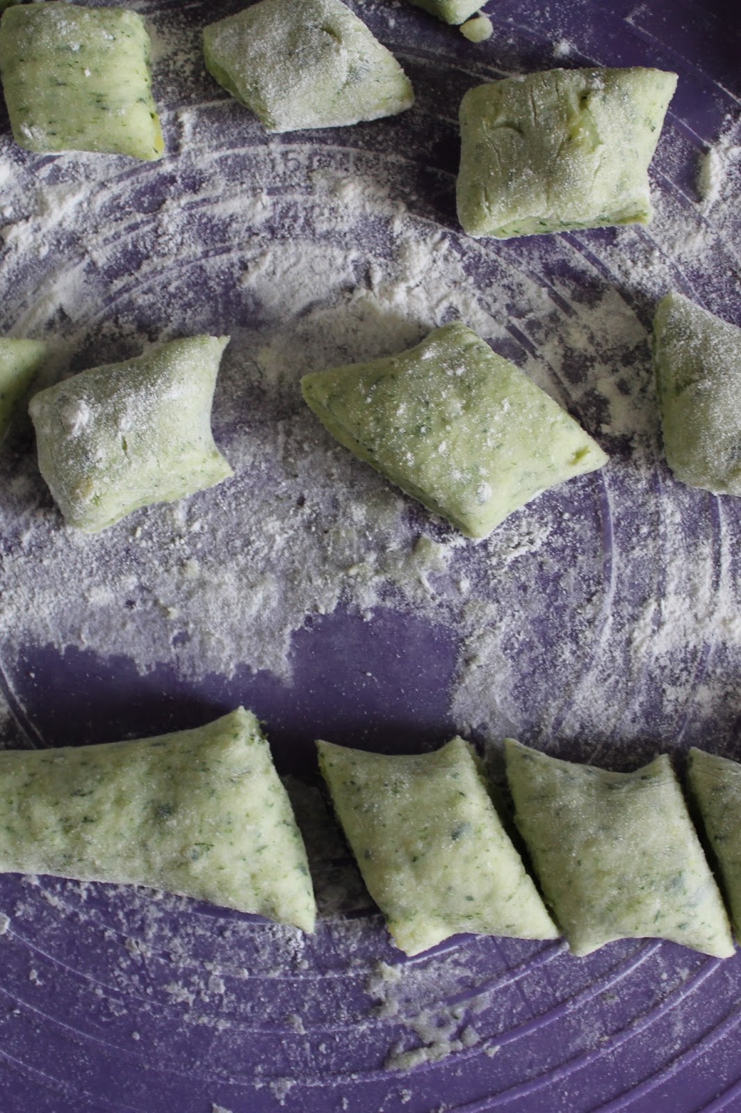 Kopytka szpinakowe: Ziemniaki obieramy ze skry i gotujemy do mi?kko?ci. Szpinak myjemy i wrzucamy na patelni?, a? zmi?knie, pod koniec gotowania dodajemy sl i pieprz. Nast?pnie odcedzamy i ubijamy na g?adkie puree za pomoc? t?uczka lub przeciskamy przez prask?. Dodajemy szpinak i ponownie mieszamy. Do jeszcze ciep?ych ziemniakw dodajemy m?k?, ponownie mieszamy i dodajemy jajko – nale?y sk?adniki bardzo szybko po??czy?, najlepiej r?k?, aby jajko nie zmieni?o si? w jajecznic?. Ciasto wyjmujemy na stolnic? (w razie potrzeby dodajemy m?ki) i dzielimy na 4 cz??ci. Jedn? cz??? ciasta dzielimy ponownie na p?, formujemy wa?ek i kroimy no?em w romby. Kopytka wrzucamy do gotuj?cej osolonej wody i gotujemy oko?o 1-2 minuty od wyp?yni?cia.