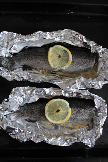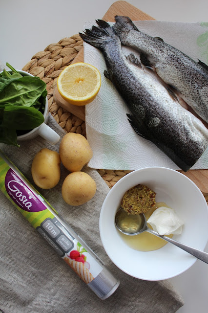 Ryba: Pstr?gi posypujemy sol?. Sk?adniki marynaty mieszamy ze sob? i nak?adamy do wn?trza ryby. Plasterki cytryny k?adziemy na pstr?gu. Ryb? k?adziemy na folii aluminiowej GOSIA i pieczemy w temp. 180 stopni przez 30 minut.
