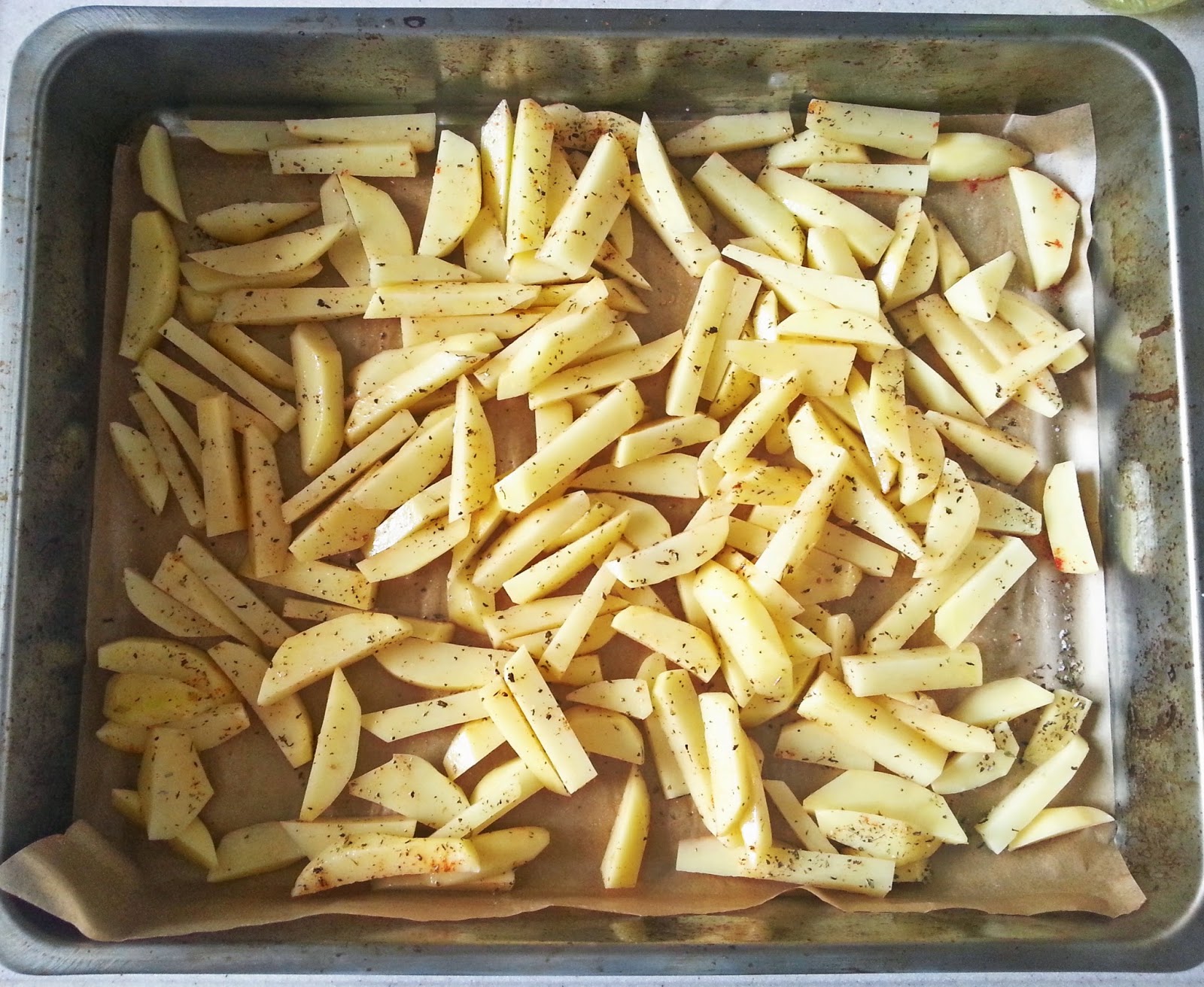 Frytki: Ziemniaki obieramy ze skry i kroimy w paski na kszta?t frytek. Polewamy odrobin? oleju, posypujemy zio?ami prowansalskimi, sol?, pieprzem i papryk? ostr?. Pieczemy, a? frytki b?d? rumiane i upieczone – od 45-60 minut (w zale?no?ci od gatunku ziemniakw).