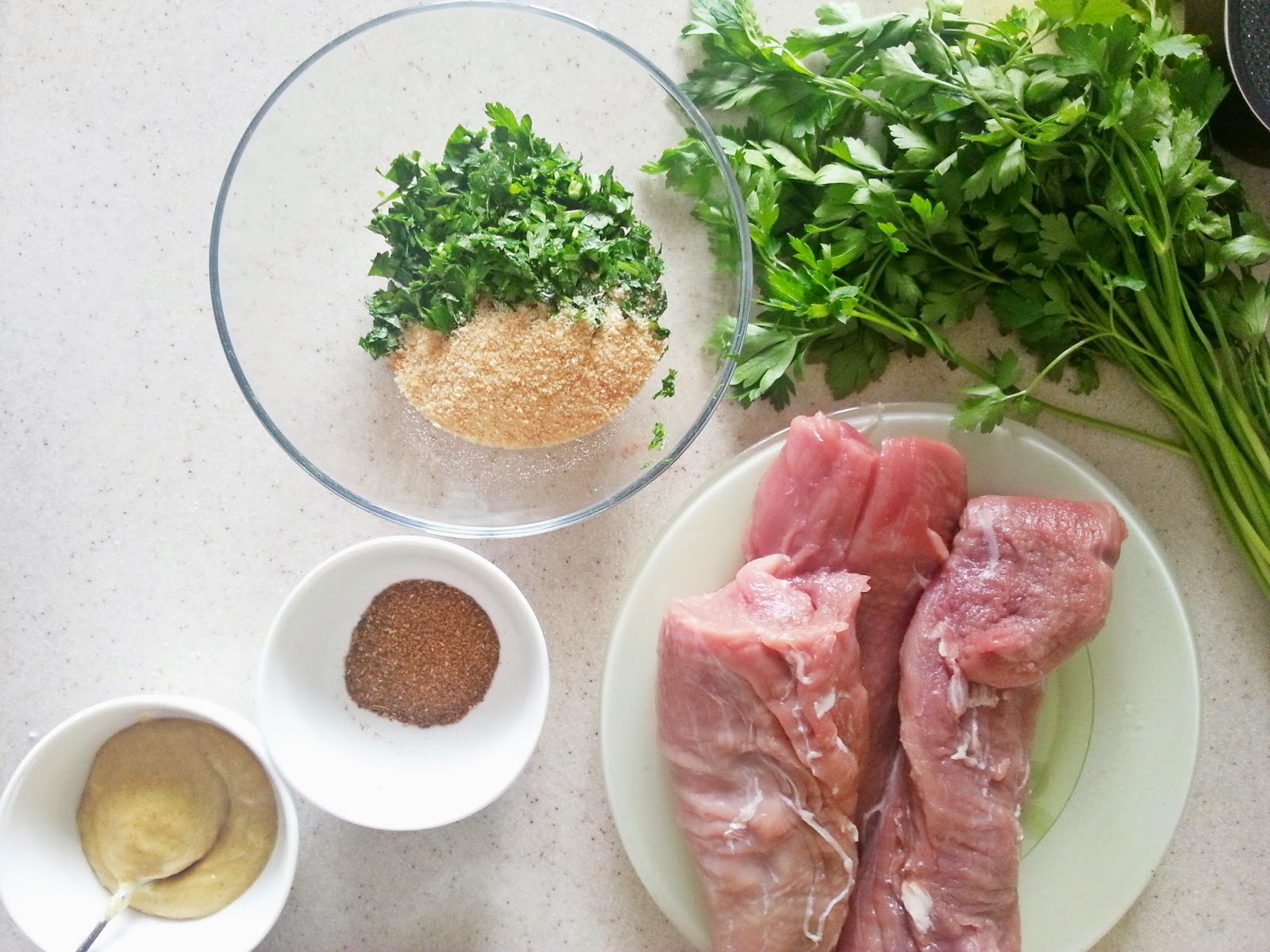 Pol?dwiczki: Pol?dwiczki oczyszczamy i kroimy na p?. Obtaczamy dok?adnie w przyprawie do wieprzowiny i przysma?amy z obu stron, a? do zarumienienia si? pol?dwiczki. Bazyli? i pietruszk? siekamy bardzo drobno, mieszamy z bu?k? tart? i olejem. Przysma?one pol?dwiczki wk?adamy do wcze?niej nagrzanego naczynia ?aroodpornego. Smarujemy musztard? z wierzchu i posypujemy zielon? posypk?. Pieczemy w piekarniku nagrzanym do 180 stopni przez 15-18 minut.