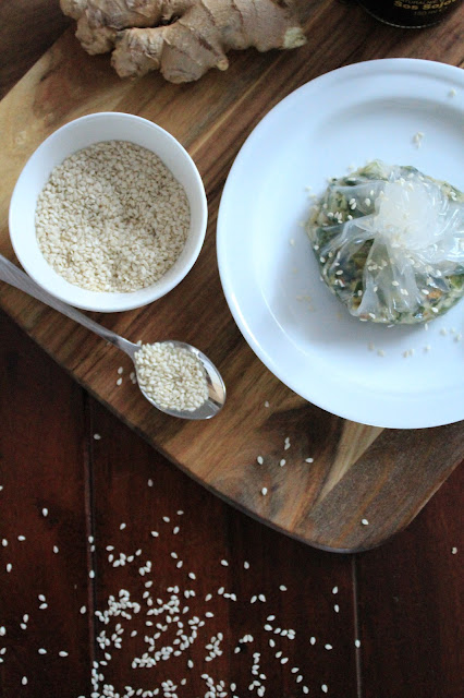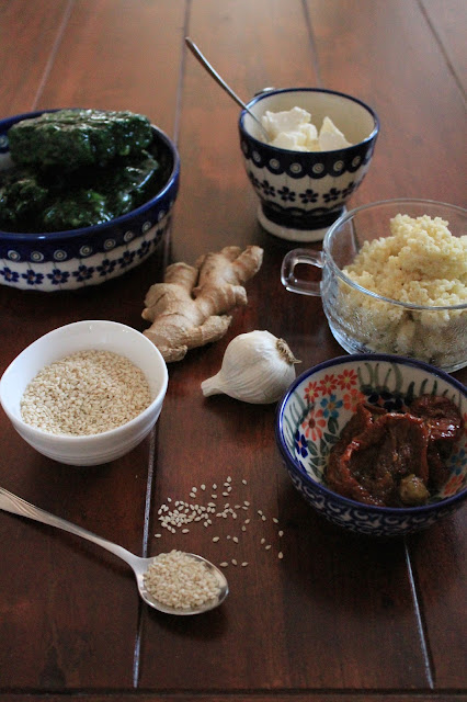Przygotowanie: Czosnek i imbir kroimy w bardzo drobn? kostk?, a suszone pomidory w nieco wi?ksz?. Rozgrzewamy olej na patelni i przysma?amy czosnek, imbir i pomidory. Szpinak myjemy (lub je?li mamy mro?ony czekamy, a? troch? si? rozmrozi) i kroimy na mniejsze kawa?ki. Wrzucamy na patelni? i czekamy, a? zmi?knie. Dodajemy kasz? jaglan? i dok?adnie mieszamy. Doprawiamy sol? i pieprzem i na koniec wrzucamy serek i wszystkie sk?adniki ??czymy. Odstawiamy do ostygni?cia. Do p?askiej miseczki wlewamy letni? wod? i wrzucamy papier ry?owy, i czekamy chwil? a? zmi?knie. Wyk?adamy go na p?misku, nak?adamy po ?y?eczce farszu i zawijamy. Metoda zawijania jest dowolna, mo?na z?o?y? jak krokiety, lub zrobi? ma?e paczuszki. Nast?pnie gotujemy piero?ki na parze oko?o 4 minuty i podajemy ciep?e z sosem sojowym i sezamem!