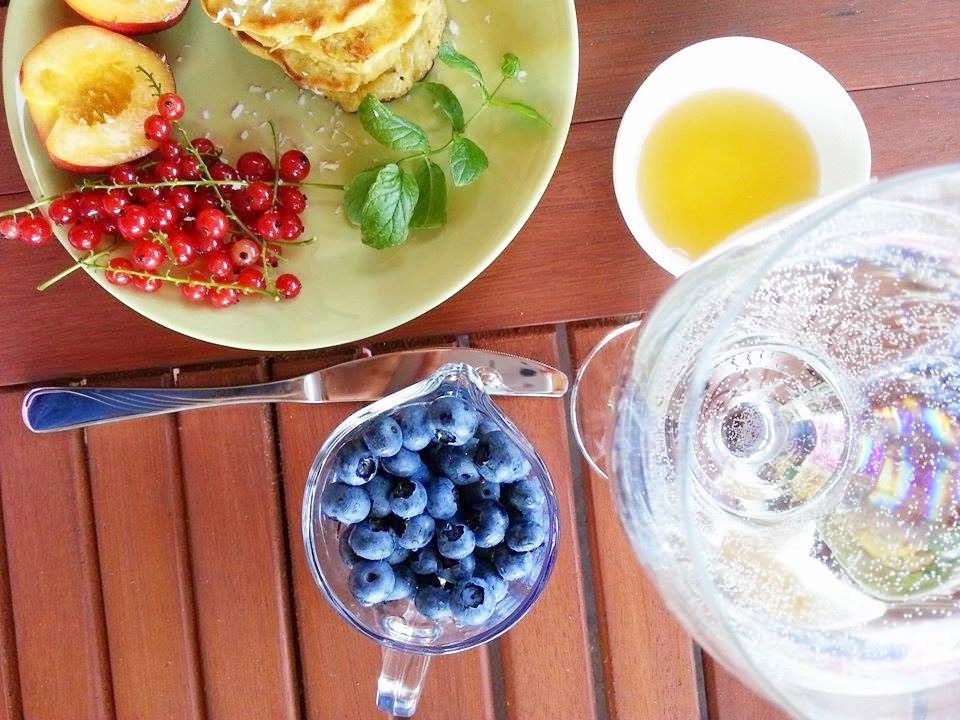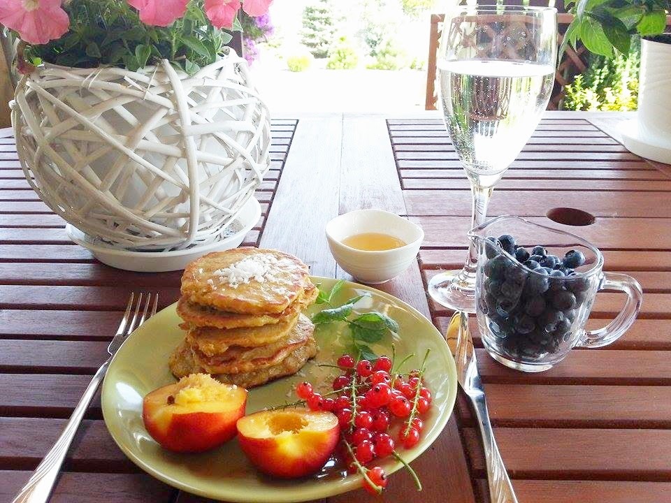 M?k?, p?atki owsiane, wirki kokosowe i sod? ??czymy ze sob?. Banana rozgniatamy za pomoc? widelca i dodajemy razem z jajkiem i ewentualnie esencj? waniliow? do suchych sk?adnikw i dok?adnie mieszamy. Ciasto powinno mie? konsystencj? jak ciasto nale?nikowe, wi?c je?li uznamy, ?e ciasto jest za g?ste najlepiej doda? odrobin? mleka, a? ciasto b?dzie sp?ywa?o po ?y?ce. Nast?pnie sma?ymy placuszki na niewielkiej ilo?ci oleju, po oko?o 1,5-2 minut z ka?dej strony (a? b?d? pi?knie rumiane). Uk?adamy na r?czniku papierowym, ?eby pozby? si? nadmiaru t?uszczu. Uk?adamy na talerzu razem z owocami, polewamy miodem i gotowe. A kto z Was dzisiaj pozwoli? sobie na odrobin? d?u?sze ?niadanie w ogrodzie? 🙂