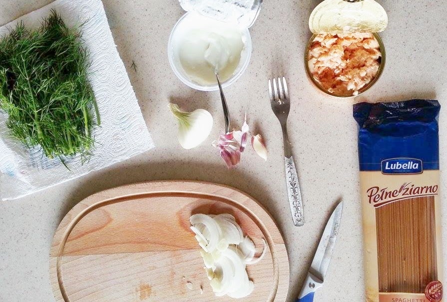 Gotujemy makaron al dente. Cebul? kroimy w pirka, a czosnek na plasterki i przysma?amy na oleju. Dodajemy ?ososia z puszki i przysma?amy. Zalewamy wszystko jogurtem i mieszamy. Je?li uznamy, ?e sos jest za g?sty to nale?y doda? do niego ?mietany (niektrzy wol? wi?cej sosu, wi?c mo?e doda? ?mietany wi?cej). Koperek i bazyli? kroimy drobno i rwnie? dodajemy do sosu. Doprawiamy sol? i pieprzem. Gdy makaron b?dzie gotowy odcedzamy go i wrzucamy do sosu, dok?adnie mieszamy i nak?adamy na talerze. Posypujemy koperkiem i gotowe! 🙂