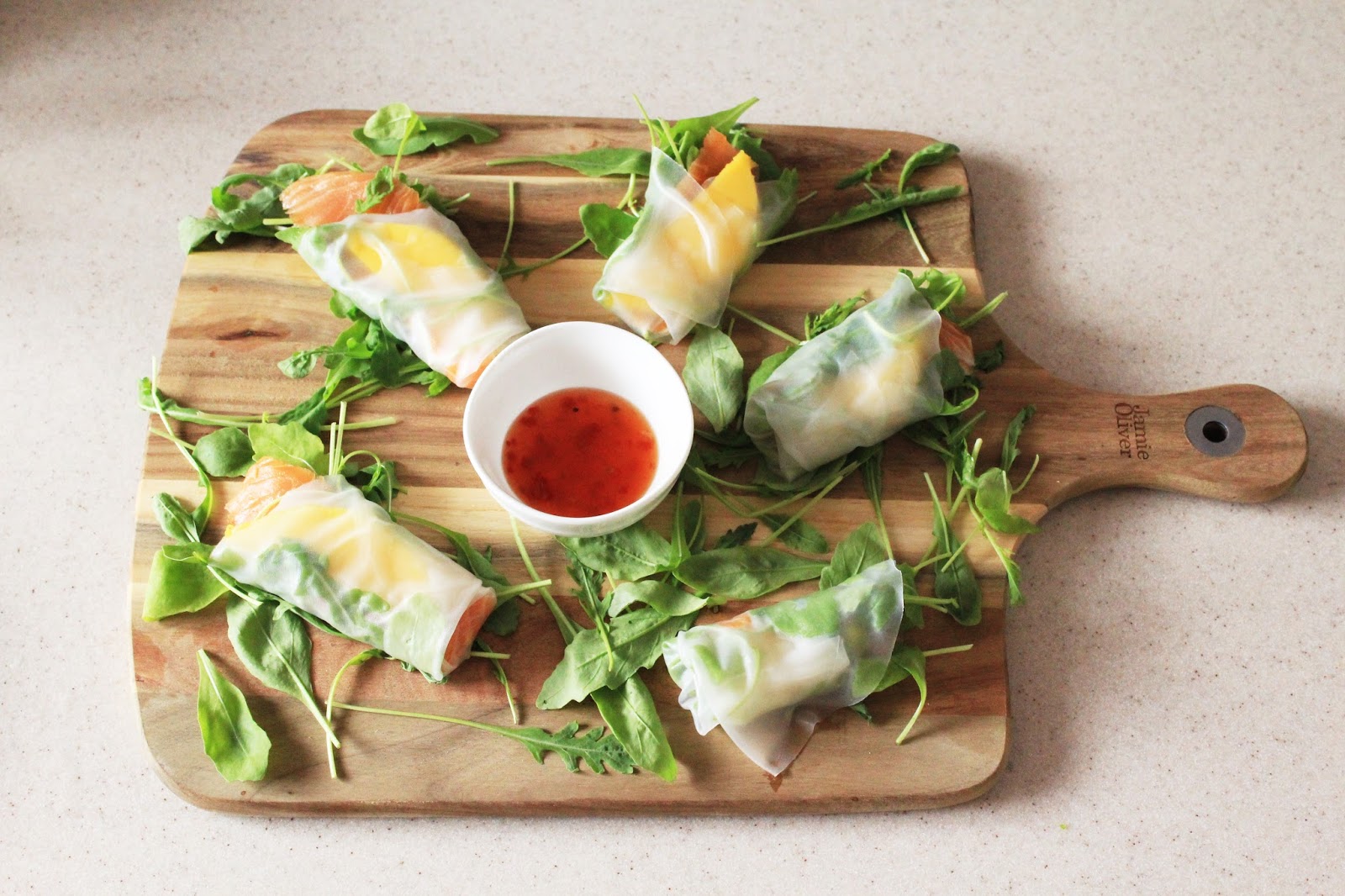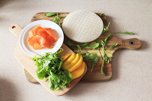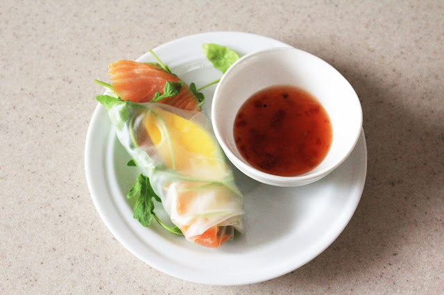 Do miski wlewamy letni? wod? i zanurzamy p?at papieru ry?owego. Gdy ju? zmi?knie wyk?adamy go na talerz. Uk?adamy na nim rukol?, ?ososia i mango i zawijamy. Podajemy z sosem chilli. Farsz mo?na u?o?y? na ?rodku papieru ry?owego i zamkn?? z ka?dej strony lub tak jak wida? na zdj?ciach zawin?? jak tortill?, ?eby farsz wystawa?.