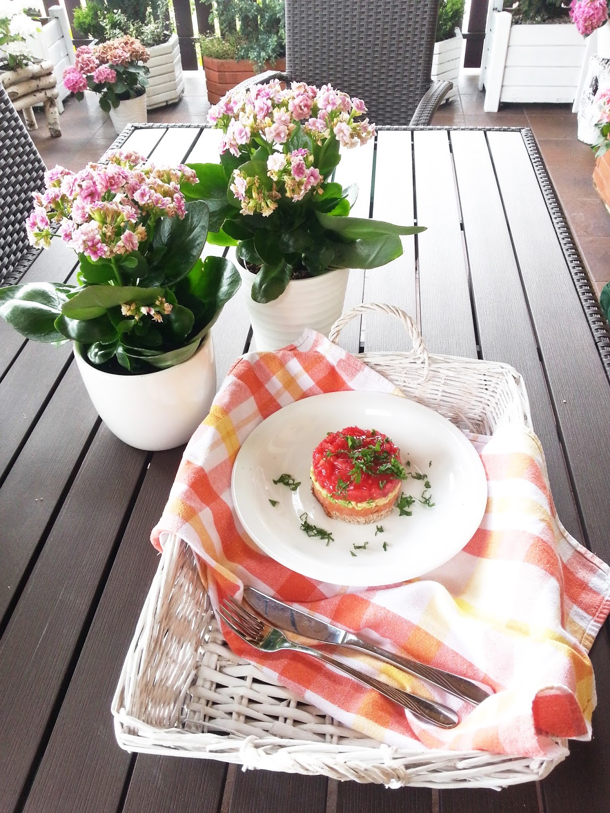 Za pomoc? specjalnego ringa (lub je?li nie macie wystarczy miseczka lub fili?anka) wykrawamy ko?o w kromce chleba. ?ososia drobno siekamy i uk?adamy na chlebie. To samo z awokado i pomidorem. Posypujemy posiekan? bazyli? i ?wie?o mielonym pieprzem.