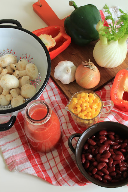 Przygotowanie: Na oleju przysma?amy cebul? i czosnek pokrojone w plasterki. Papryk? czerwon? i zielon? kroimy w wi?ksz? kostk?, a koper w du?o drobniejsz?. Gdy cebula si? zeszkli dodajemy warzywa i przysma?amy oko?o 10 minut. Pieczarki kroimy w ?wiartki i dodajemy do warzyw i sma?ymy kolejne 5 minut. Dodajemy sok pomidorowy i przypraw? do kuchni meksyka?skiej. Gotujemy 10 minut i dorzucamy kukurydz? i fasol?. Dusimy jeszcze ca?o?? oko?o 5 minut. Podajemy z tortill? i jogurtem naturalnym.