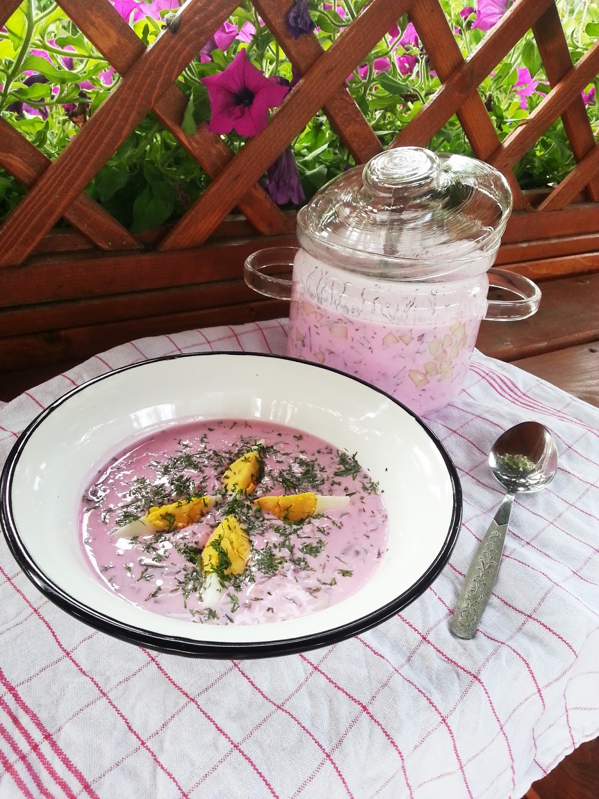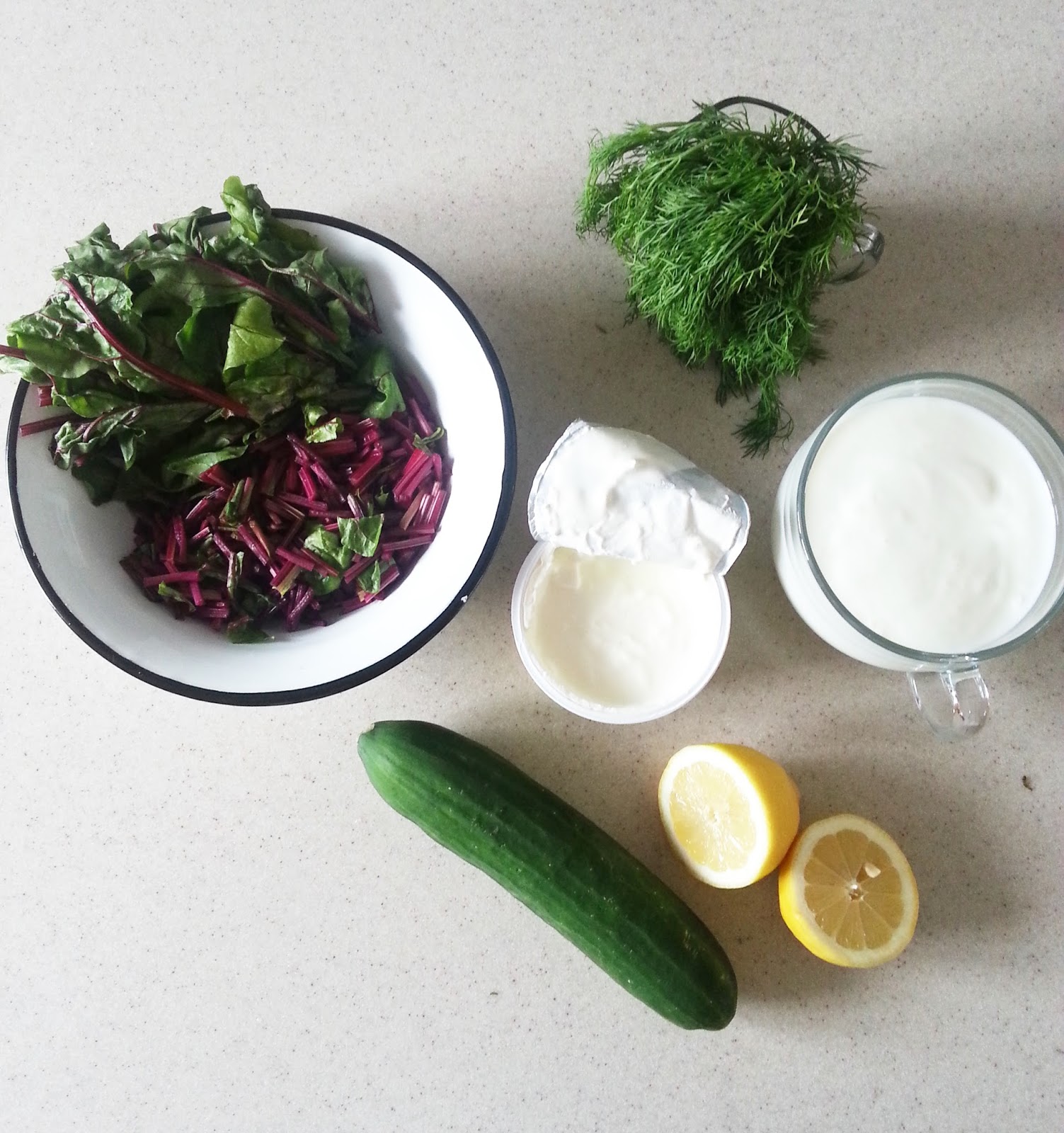 Botwin? myjemy i kroimy ?odygi na mniejsze cz??ci (li?cie odk?adamy na bok). Zalewamy szklank? wody i gotujemy do mi?kko?ci. Dodajemy sok z cytryny, cukier i sl. Pod koniec gotowania dodajemy posiekane li?cie botwiny. Odstawiamy do ostudzenia. Zsiad?e mleko ubijamy trzepaczk? razem ze ?mietan?. Ogrek kroimy w drobn? kostk?, usuwaj?c wcze?niej nasiona, a koperek drobno siekamy. Ogrek i koperek dodajemy do mleka ze ?mietan?. Nast?pnie wlewamy botwin? z wywarem i dok?adnie mieszamy. Dodajemy sl i pieprz do smaku. Ch?odnik podajemy z jajkiem i posypujemy koperkiem.