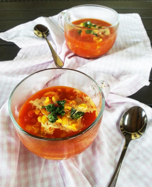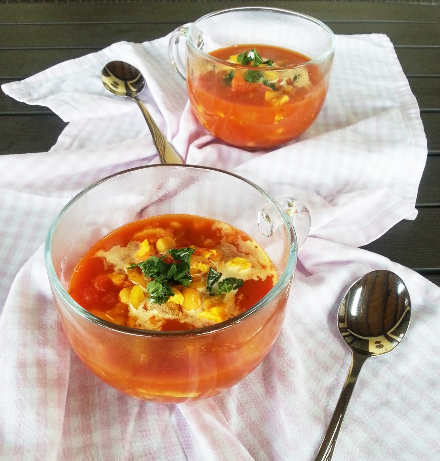 W du?ym garnku rozgrzewamy olej rzepakowy i sma?ymy cebul? pokrojon? w p?ksi??yce i rozdrobniony czosnek. Nast?pnie dodajemy przyprawy: po ?y?eczce kurkumy, oregano, bazylii. Dodajemy rwnie? ostr? papryk? (wg stopnia ostro?ci, ktry lubimy). Sma?ymy oko?o minuty ca?o?? i dorzucamy seler naciowy pokrojony w plasterki. Dodajemy pomidory pelati i podlewamy bulionem. Gotujemy oko?o 10 minut. Nast?pnie wrzucamy ciecierzyc? i kurczaka pokrojonego w kostk?. Wlewamy sok pomidorowy (je?li zupa jest za kwa?na zamiast soku dodajemy wody lub bulionu). Gotujemy oko?o 10 minut. Pod koniec gotowania dodajemy ?mietan?. Dekorujemy ?wie?? bazyli?.
